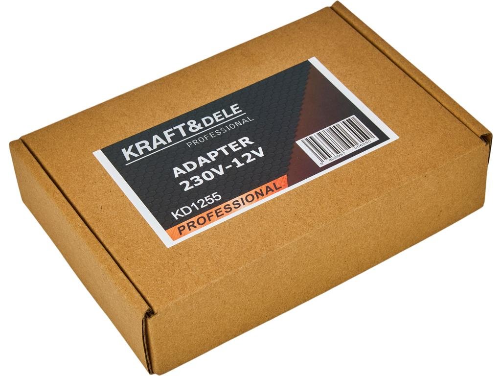 Адаптер AC/DC 230-12 V KD1255 от марката Kraft & Dele, висококачествен преобразувател на напрежение от електрическата мрежа, оборудван със гнездо за запалка на автомобил 12V DC, позволява свързване на устройства, предназначени за автомобили, каравани и офиси, без да се налага намеса в конструкцията им.