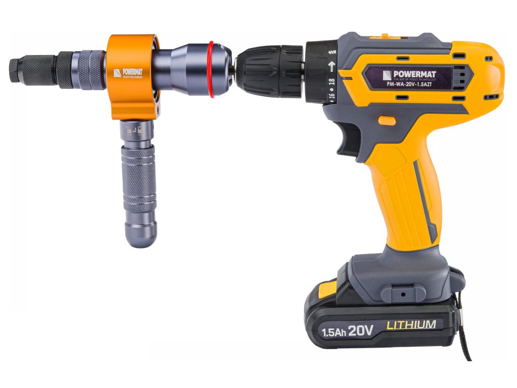 Професионален адаптер 3в1 POWERMAT позволява лесно и бързо закрепване с нитони гайки и нитове. Компактната му ергономична конструкция и подсилен вътрешен лагерен механизъм заедно с Т-образна дръжка осигуряват необходимата сила за работа с големи и твърди нитове и гайки.