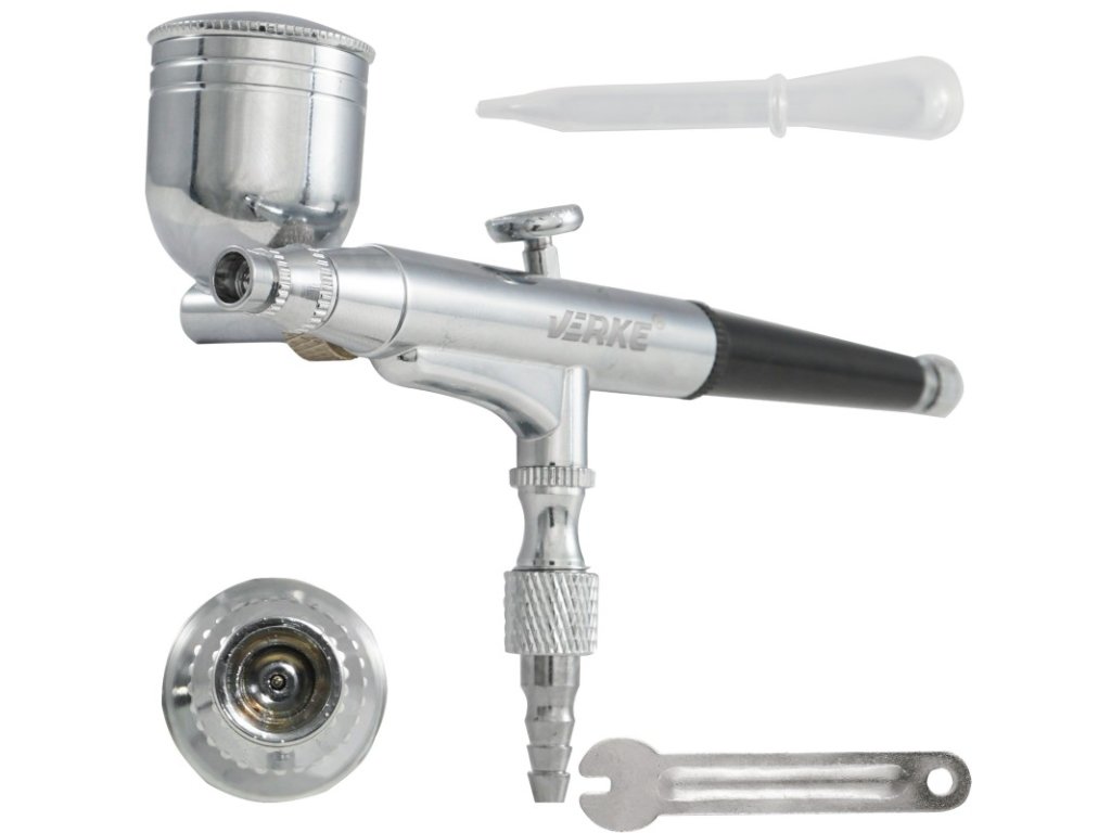 Аерограф AB-132 VERKE V81287 - миниатюрен пистолет, предназначен за прецизно рисуване. Този ръчен инструмент с малки размери служи за нанасяне на боя чрез разпръскване с въздушен поток. Следата от боя се характеризира с равномерно покритие и меки, размити ръбове. Рисуването може да се извърши удобно чрез нанасяне директно върху повърхността, или чрез подходящи шаблони.