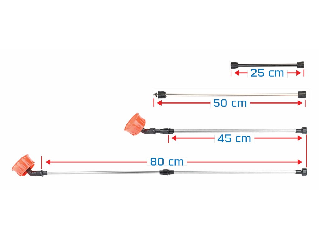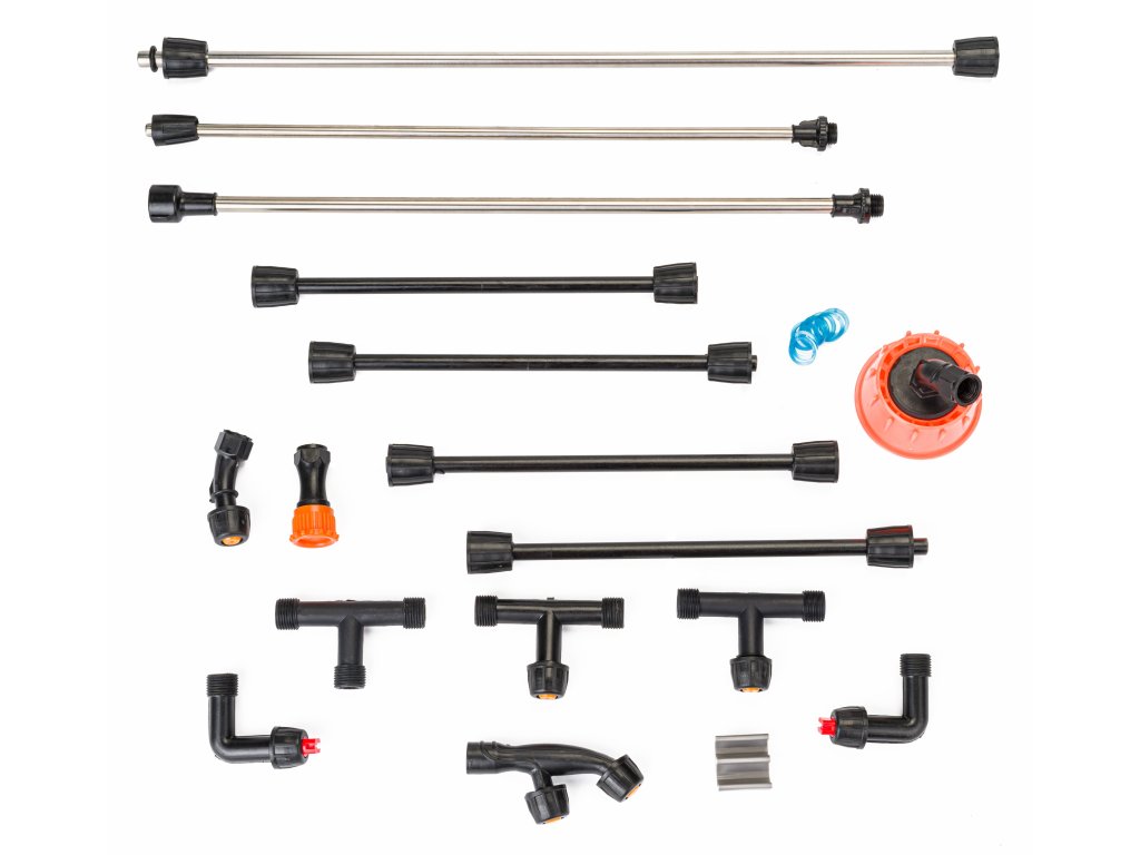 Подреден комплект компоненти за пръскане, включващ тръстикови дръжки, удължители, съединители, дюзи и уплътнения, който позволява лесното сглобяване на персонализирана система за пръскане за: