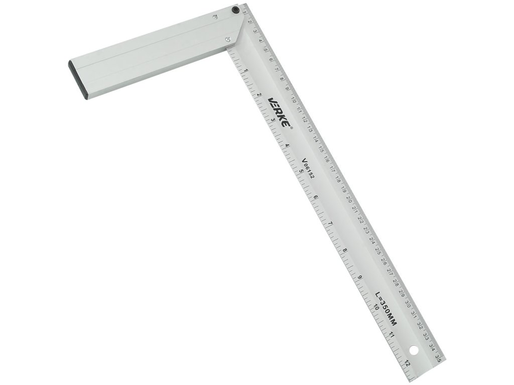 Алуминиев ъгълник 350 мм VERKE V06152, изработен от закален алуминий. Мащабната линия е трайно нанесена в черен цвят. Разполага с милиметрова и инчова скала. Позволява прецизни измервания, отбелязване на прав ъгъл и очертаване при дърводелски, строителни и измервателни дейности.