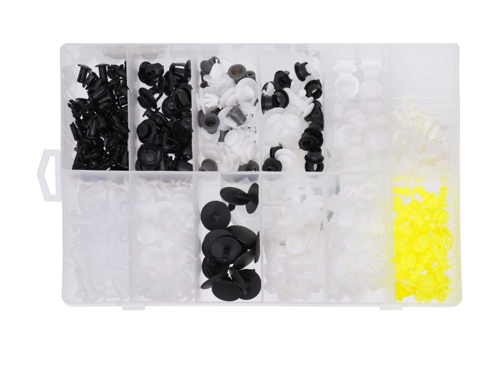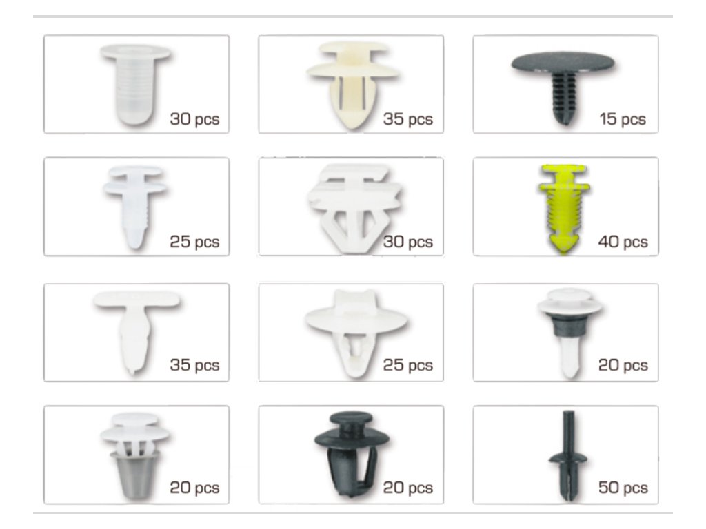 Автомобилни крепежни скоби, резервна част за PEUGEOT, 345 бр. са незаменим аксесоар за всеки автомобилен ентусиаст. Съдържанието на комплекта включва 12 различни вида скоби, общо 345 броя, които осигуряват лесен и ефективен ремонт или поддръжка на вашия автомобил.