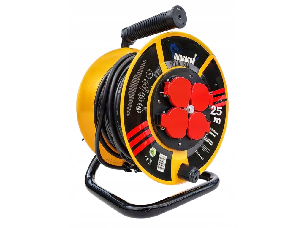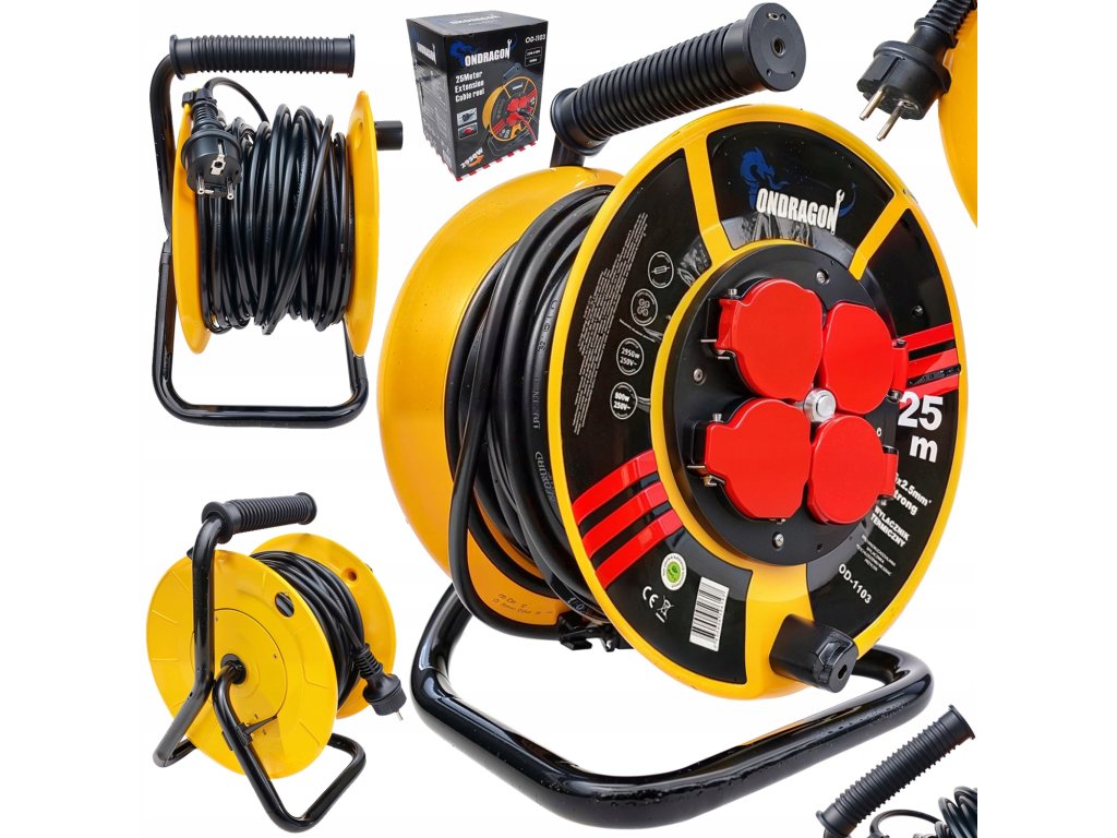 Барабанен удължителен кабел с дължина 25 м и сечение на проводника 3×2,5 мм² е надеждно решение за строителни обекти, работилници, гаражи, градини и домакинства. Здрава метална конструкция и устойчива PVC изолация предпазват кабела от механични повреди, атмосферни влияния и химикали като масла или бензин.
