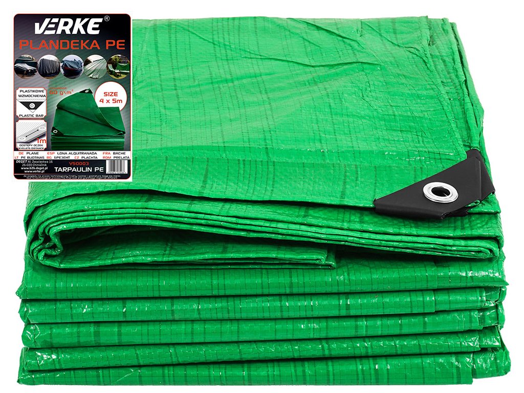 Брезентов покривен 4x5м PE 60г VERKE V50003 е предназначен за покриване и защита на предмети както на закрито, така и на открито. Идеален за покриване на автомобили, ремаркета, лодки, навеси, строителни и земеделски материали, дървени складове, градински мебели и басейни. Използва се в земеделието, строителството, домакинствата и други. Ръбовете на брезента са завършени с двойно подсилен кант за по-голяма здравина.