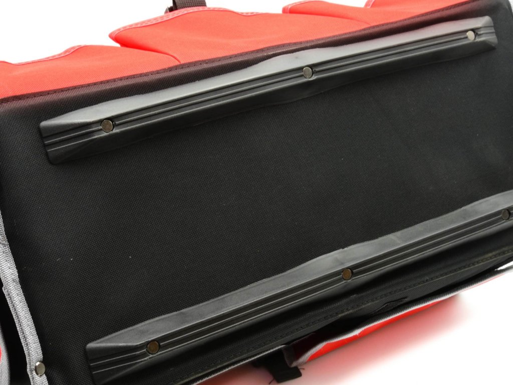 Страните на чантата са оборудвани с еластичен джоб от мрежеста материя, място за етикет, държач за рулетка, джоб с велкро и ремък с катарама.