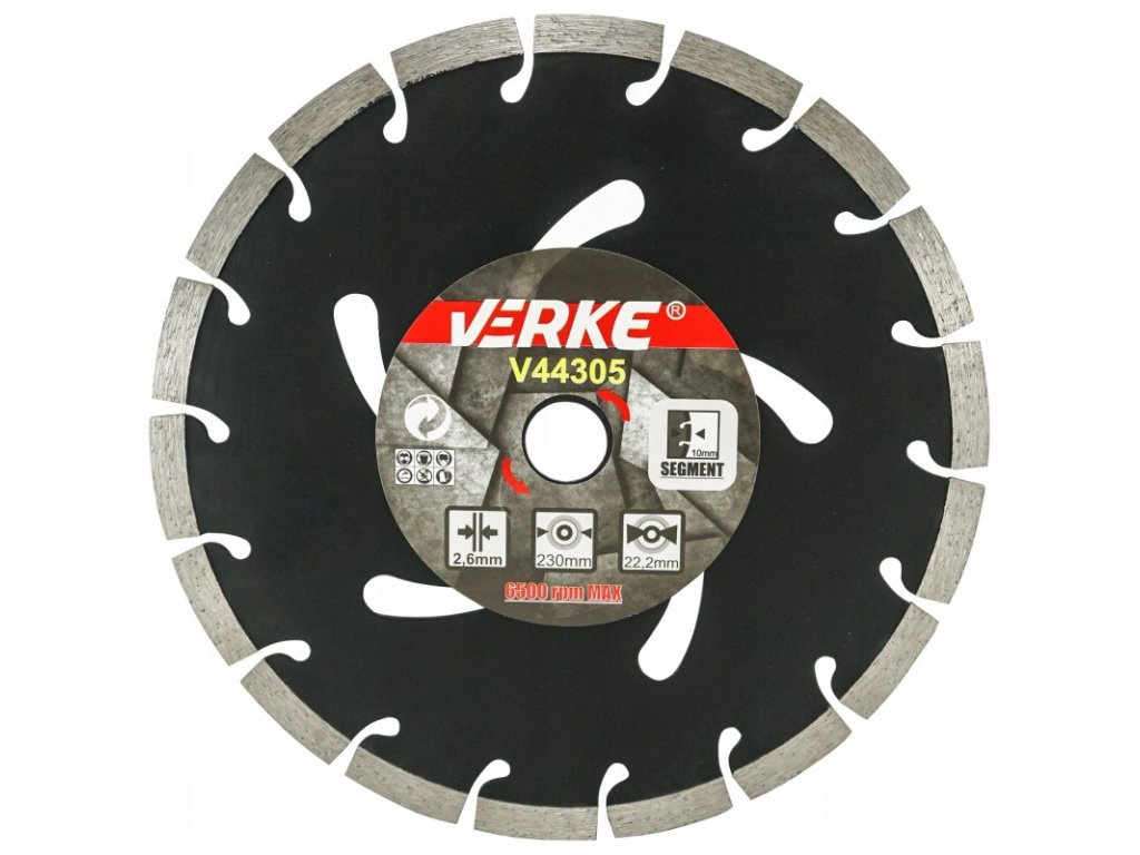 Професионален диамантен диск сегментен от марката VERKE, предназначен за рязане на твърди строителни материали. Специалната форма на ръба на диамантения диск осигурява по-висока скорост на рязане при най-твърдите материали без загуба на качество на обработката.