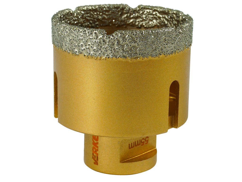 Диамантена боркорона М14, 55 мм VERKE V05155 е оборудвана с монтажна резба M14 за закрепване в ъглошлайфи. Идеална за пробиване на отвори в материали като: гранитогрес, керамични плочки, клинкер, глазура и естествен камък.
