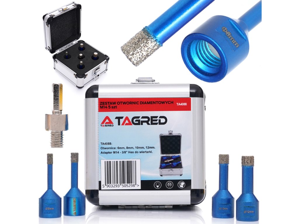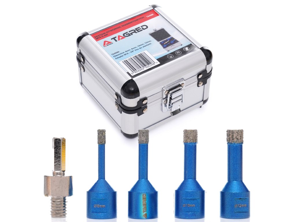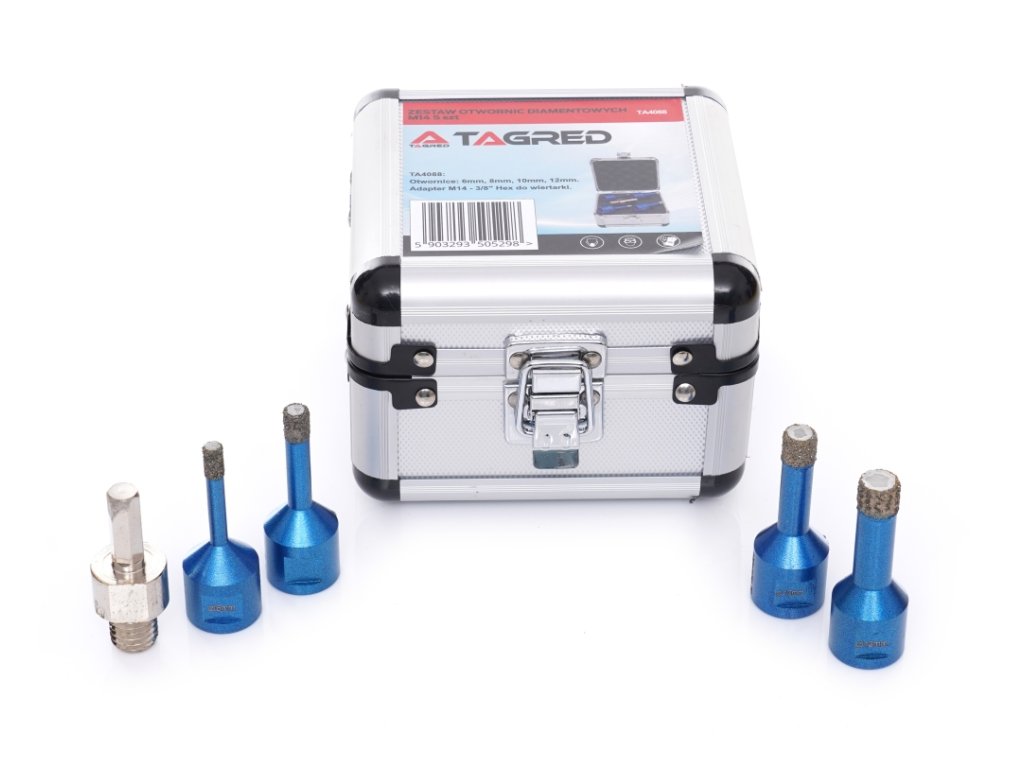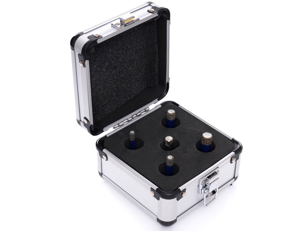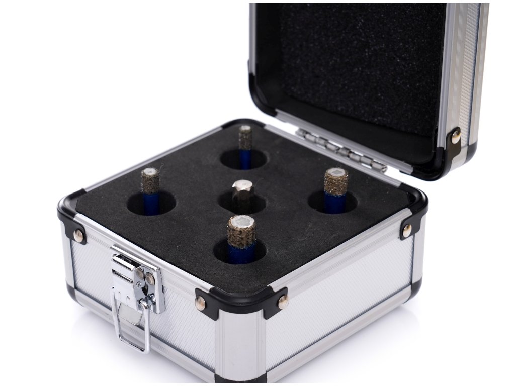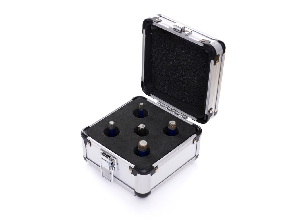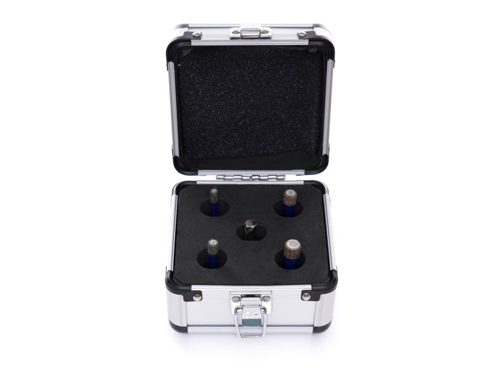 Диамантени боркорони за керемика, камък, гранитогрес, плочки 6, 8, 10, 12 мм M14, куфар, адаптер, 5 бр.