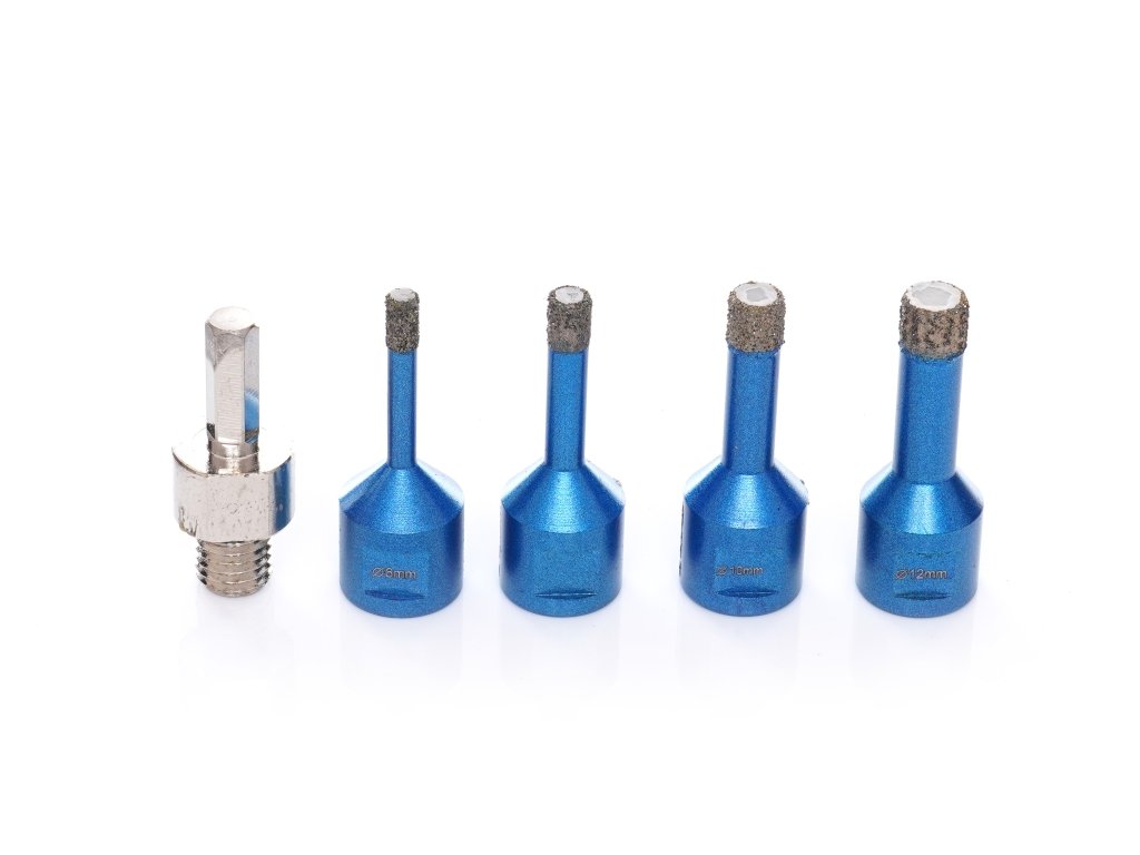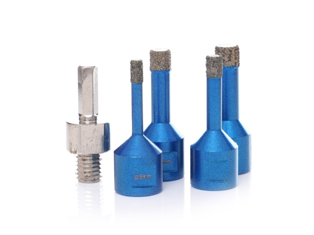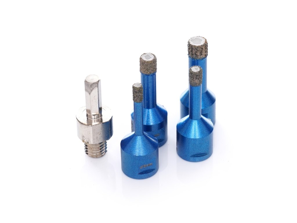 - Диамантени боркорони за камък, гранитогрес и плочки с размери 6, 8, 10 и 12 мм