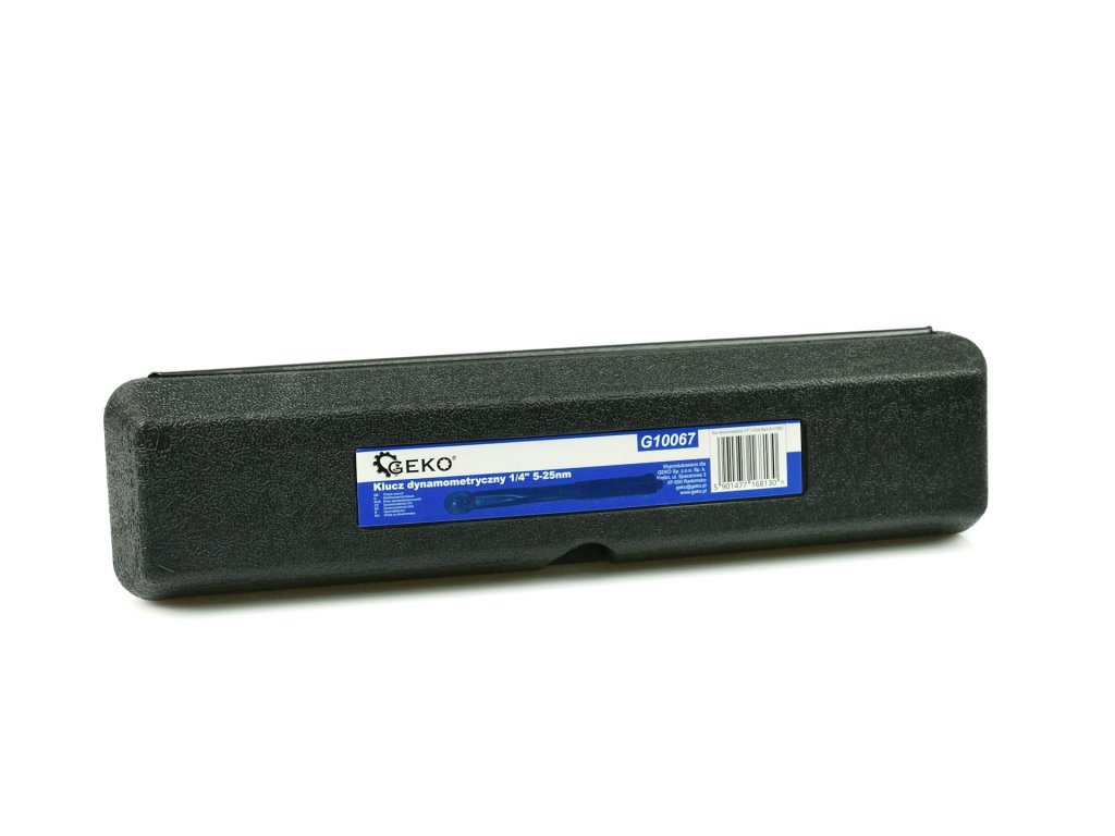 Оборудван е с гнездо 1/4” и работи в обхват 5-25 Nm. Ключът е изработен от висококачествена инструментална стомана CrV, която гарантира дълъг живот и издръжливост. Насечена стоманена дръжка осигурява здрав и удобен захват за безопасна и комфортна работа.