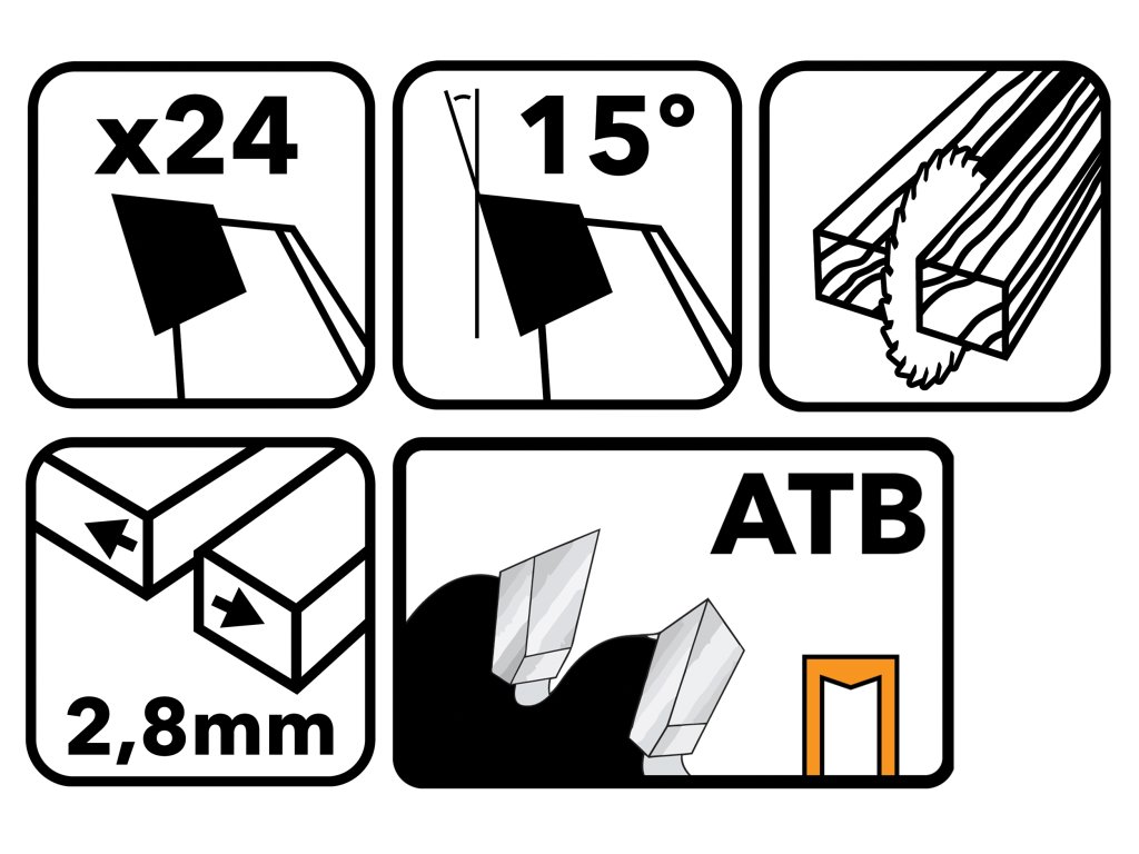 Здрав диск от закалена стомана, оборудван с 24 режещи зъба, които осигуряват дълъг живот и ефективно рязане.