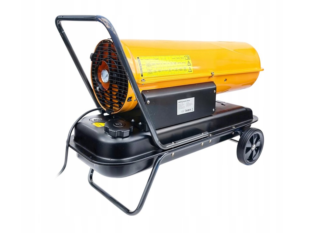 Нагревателят е оборудван с мощен вентилатор с въздушен поток от 850 m³/h, който осигурява равномерно разпределение на топлината. Здравата конструкция с големи колела позволява лесно пренасяне и гъвкаво използване.