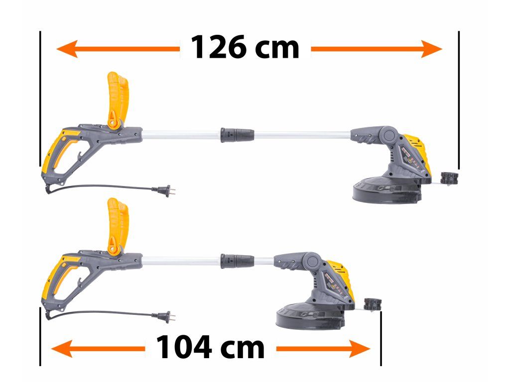 Телескопична дръжка позволява регулиране на дължината на косачката от 104 см до 126 см, осигурявайки максимално удобство при работа.