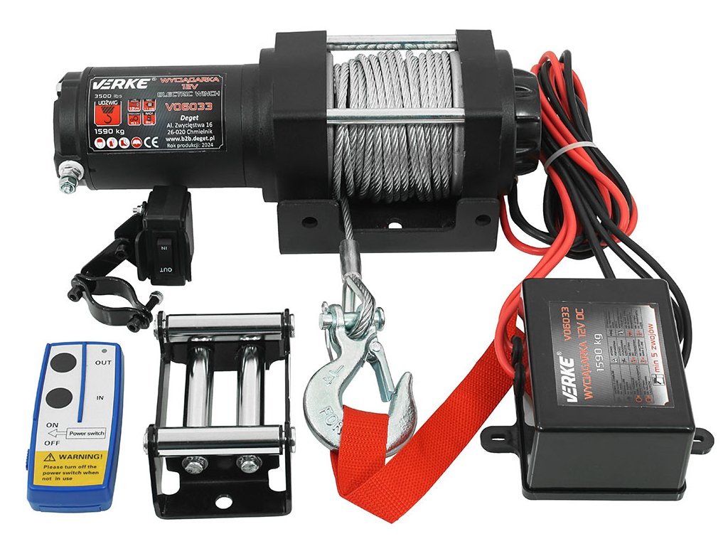 Електрическа лебедка 12V, 3500 LBS, стоманено въже 12м VERKE V06033 е перфектното решение за потребителите на АТВ-та, четириколки, офроуд автомобили и ремаркета. Осигурена е с автоматична спирачка, която при загуба на напрежение веднага спира лебедката.