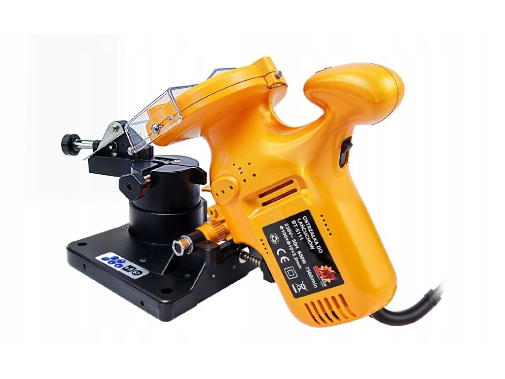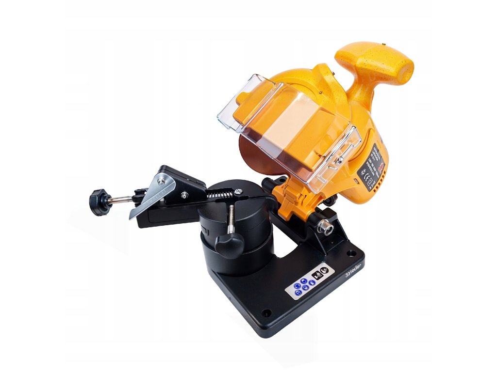 Мощна електрическа шлайфмашина за вериги с мотор с мощност 650W, идеална за бързо и ефективно заточване на вериги, използвани както при електрически, така и при бензинови триони. Тази шлайфмашина е оборудвана с плъзгаща се менгеме с ограничител и регулируем ъгъл на шлифоване до 35 градуса, което осигурява гъвкавост за различни видове вериги.