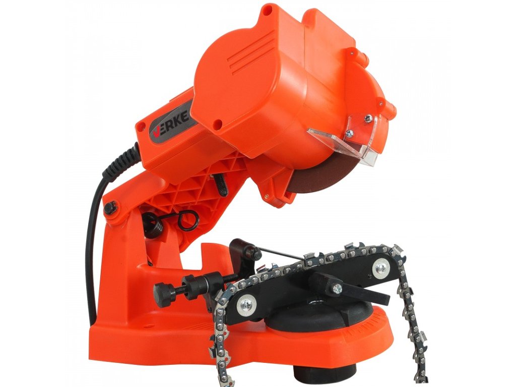 Електрическа шлайфмашина за вериги 90W VERKE V90080 е мощно и надеждно устройство, предназначено за заточване на вериги за моторни и електрически триони. Специалната конструкция на шлайфмашината позволява заточване на всяко зъбче от веригата по един и същ, повторяем начин. Тази машина е оборудвана с мощен мотор с мощност 90 W, шлайфачен диск с диаметър 104 мм и настройващ се въртящ тисков държач с регулиране на ъгъла на заточване, което улеснява бързото и ефективно заточване на веригите.