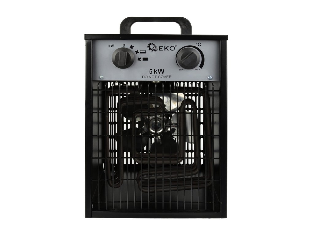 Електрически нагревател 5 kW G80402 с вграден термостат е високоефективно устройство за осигуряване на чисто и безопасно отопление. Идеален е за отопление на различни жилищни и помощни помещения като мазета, гаражи и работилници. Благодарение на лесното му управление, леката конструкция и пълната преносимост, този нагревател е подходящ за периодично или аварийно отопление на помещения. След включване и настройка на температурата на 0 градуса, може да се използва и като вентилатор.