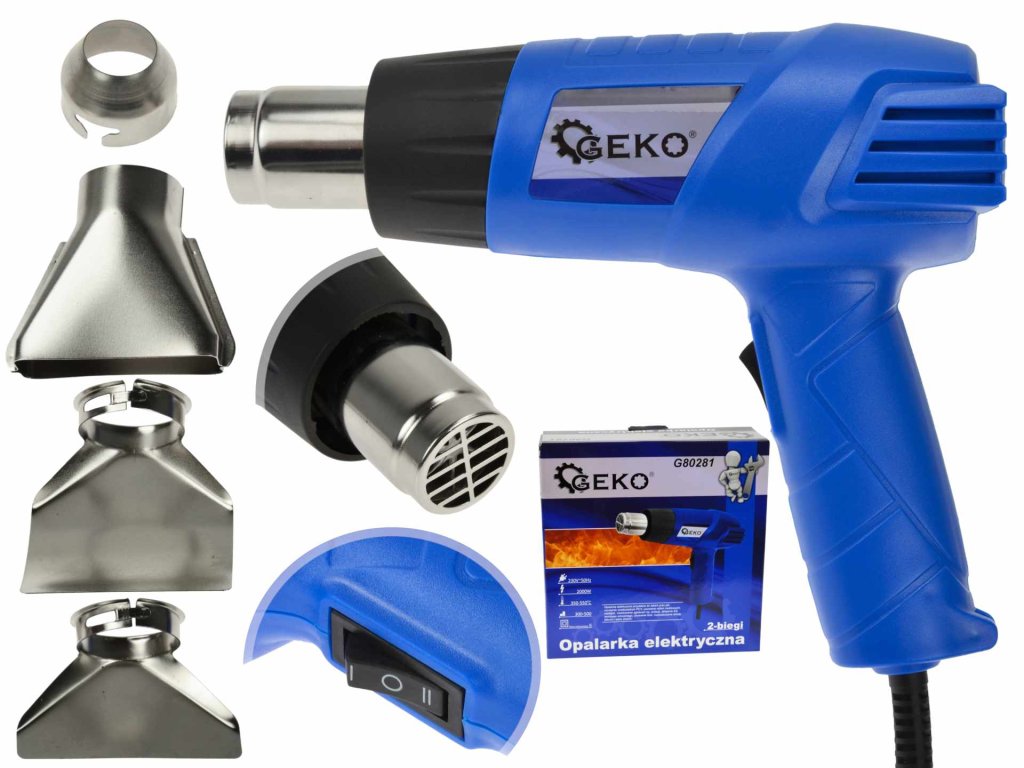 Електрически пистолет за горещ въздух 2000W + дюзи G80281 е висококачествен инструмент, оборудван с мощен електрически мотор с мощност 2000W, който достига температура до 550°C. Пистолетът разполага с тристепенен превключвател, позволяващ настройка на две температурни степени и различен въздушен поток. Този горещ въздушен пистолет е идеален за премахване на стари бои, различни видове лепила и работа с термосвиваеми материали. Освен това може да се използва и за запалване на камини или скара без помощта на запалител.