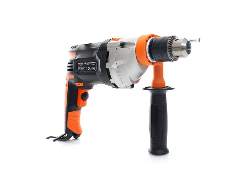 Електрическа ударна бормашина 1700 W KD1687 е предназначена за ударно пробиване в зидария, бетон и камък, както и за пробиване в метал, керамика, дърво и пластмаса. Главната ръкохватка е изработена от специален противохлъзгащ материал, който улеснява държането на инструмента в ръката. Това е версия с допълнителна странична ръкохватка. Главата е метална.