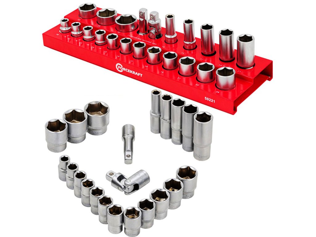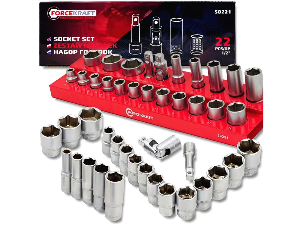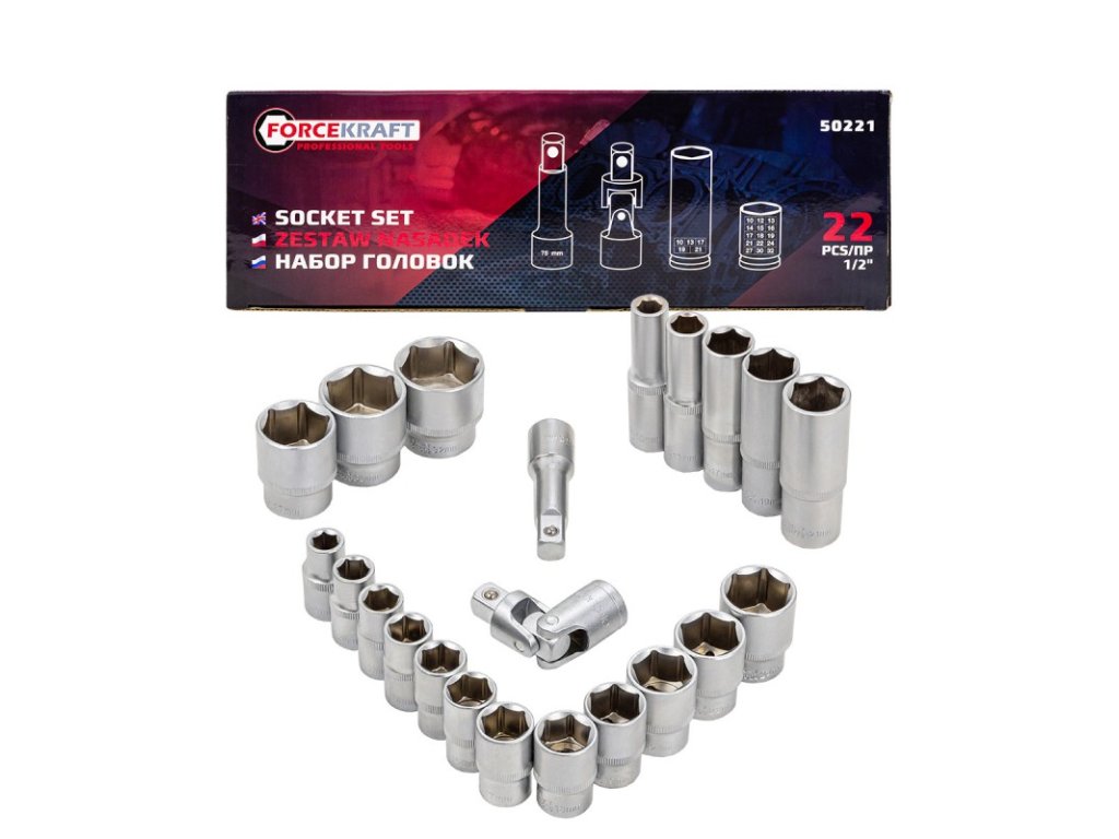 Forcekraft FK-50221 е функционален и здрав комплект от 22 броя 1/2" гилзи, включващ както стандартни, така и удължени варианти. Гилзите от висококачествена инструментална стомана с шестостенен профил осигуряват сигурен захват и максимална издръжливост дори при интензивна употреба с ударни или ръчни ключове.