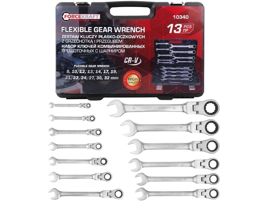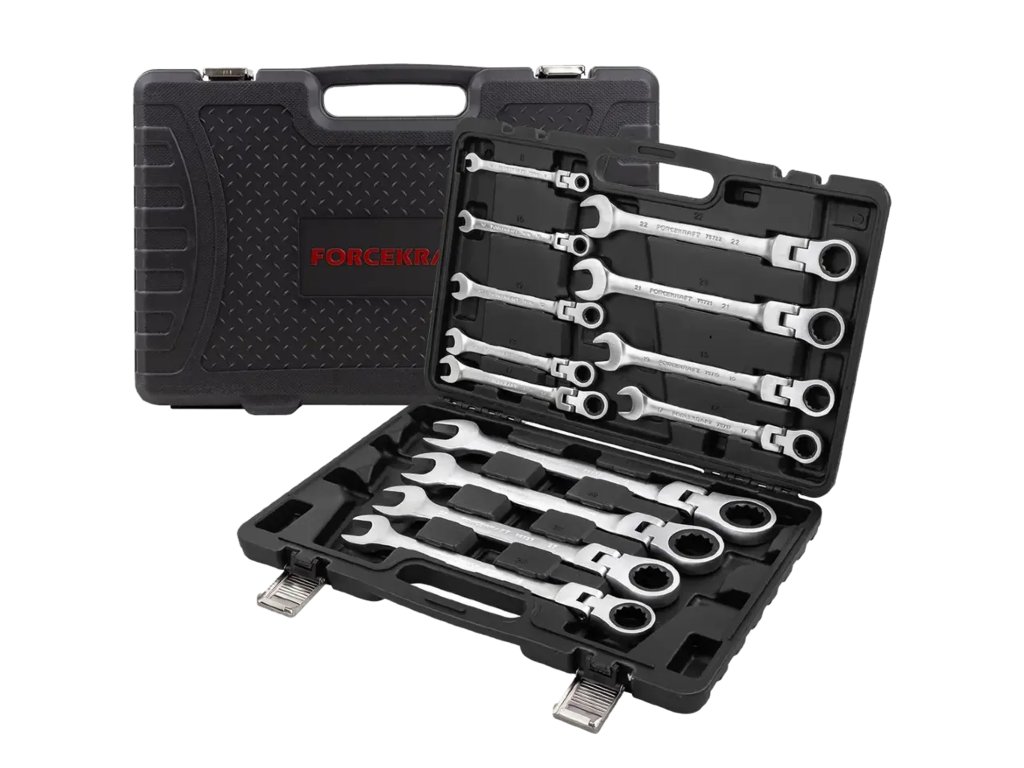 Професионалният комплект комбинирани ключове с шарнир и тресчотка Forcekraft е идеалното решение за механици, сервизни техници и взискателни майстори, които изискват качество, издръжливост и комфорт при работа. Благодарение на комбинацията от тресчотка, подвижен шарнир и прецизна изработка от хром-ванадиева стомана (Cr-V), този комплект ще се докаже както в автосервизи, така и при обикновени ремонти или монтажи.