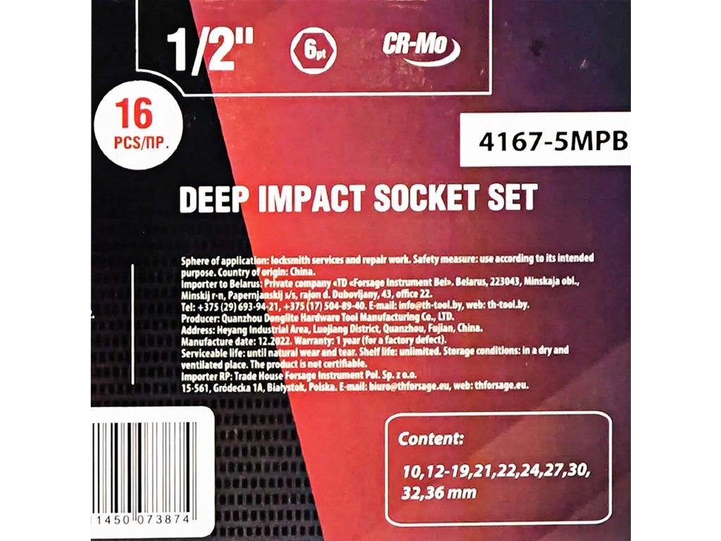 - Размери на главите 1/2" (удължени, 6-стенни): 10 мм, 12 мм, 13 мм, 14 мм, 15 мм, 16 мм, 17 мм, 18 мм, 19 мм, 21 мм, 22 мм, 24 мм, 27 мм, 30 мм, 32 мм, 36 мм