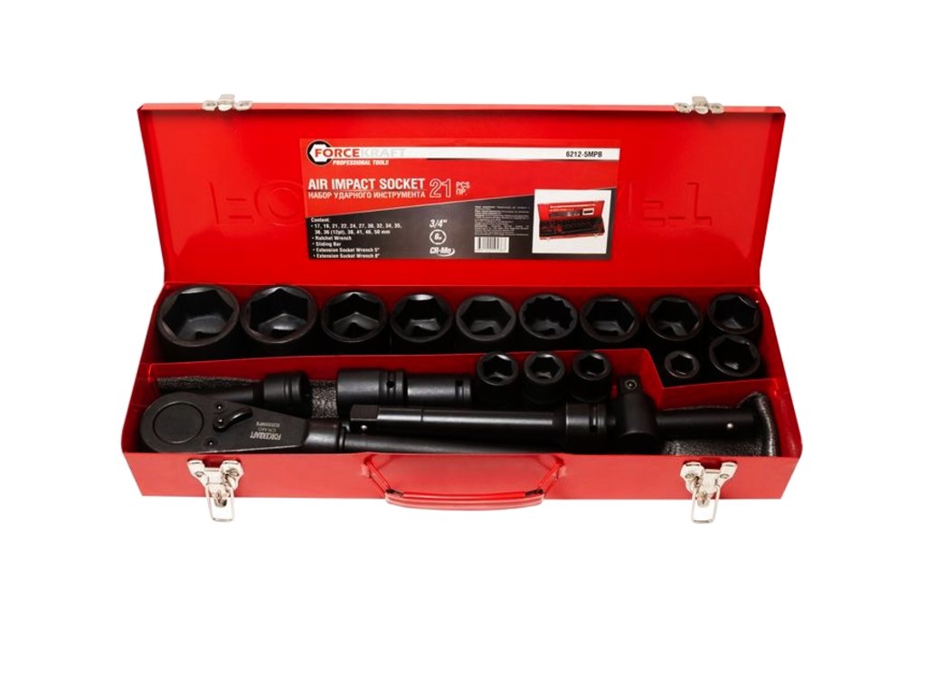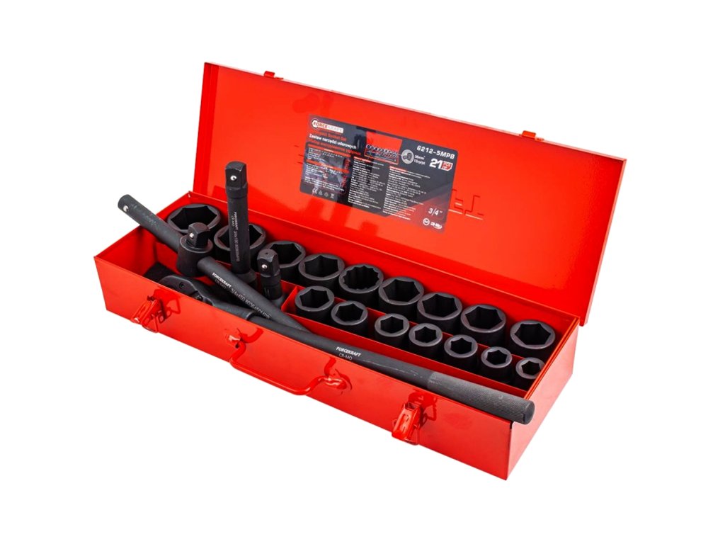 - Ударни гнезда 3/4" 12-стенни – 16 бр.: размери 17, 19, 21, 22, 24, 27, 30, 32, 34, 35, 36 (x2), 38, 41, 46, 50 мм