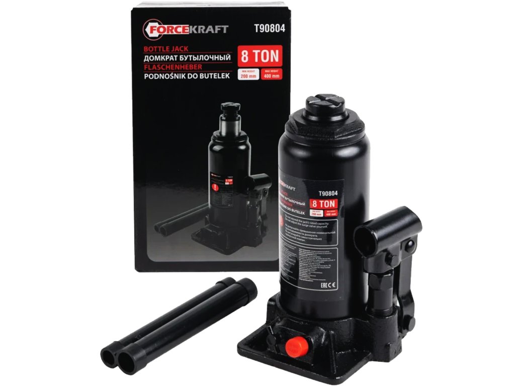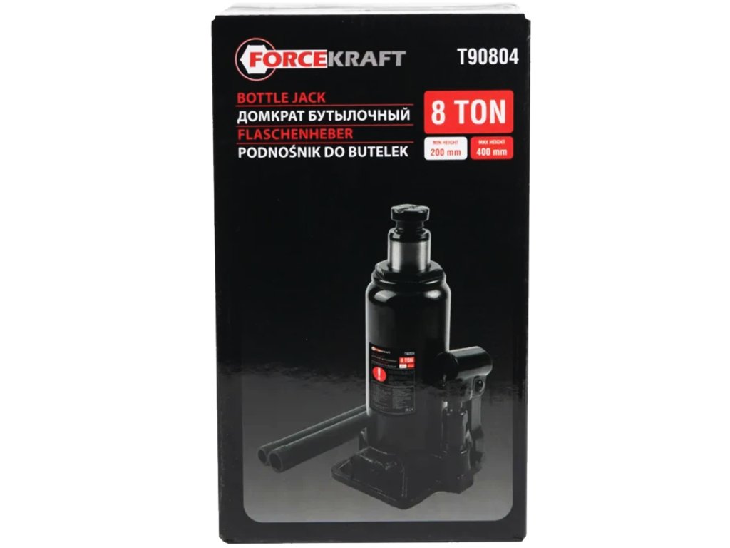 Хидравличният бутиличен крик FORCEKRAFT с товароподемност 8 тона е надежден инструмент за повдигане на леки и товарни автомобили, селскостопански и промишлени машини. Оборудван с предпазен клапан, той осигурява безопасна работа без риск от претоварване.