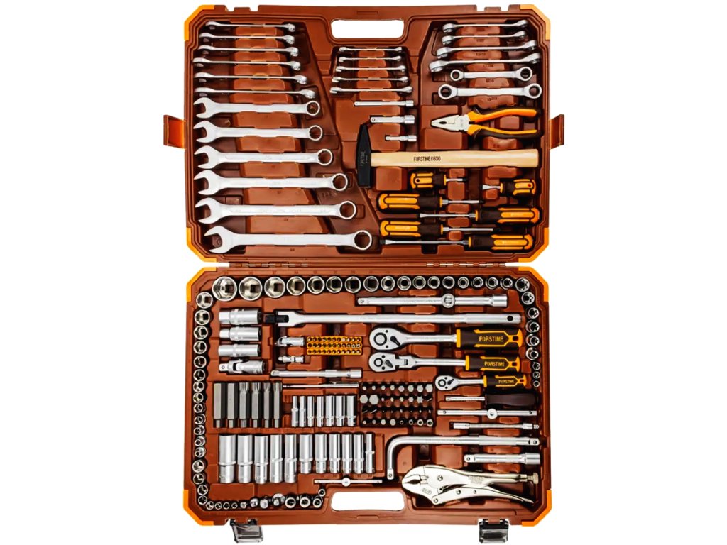 Универсален комплект инструменти, съдържащ богат избор от накрайници, битове и аксесоари в стандарти 1/4", 3/8" и 1/2". Отличен както за професионален автосервиз, така и за домашната работилница на всеки майстор. Благодарение на наличието на шестостенни, дванадесетостенни, E-профилни и TORX накрайници, комплектът позволява работа с почти всички често срещани видове болтове и гайки.