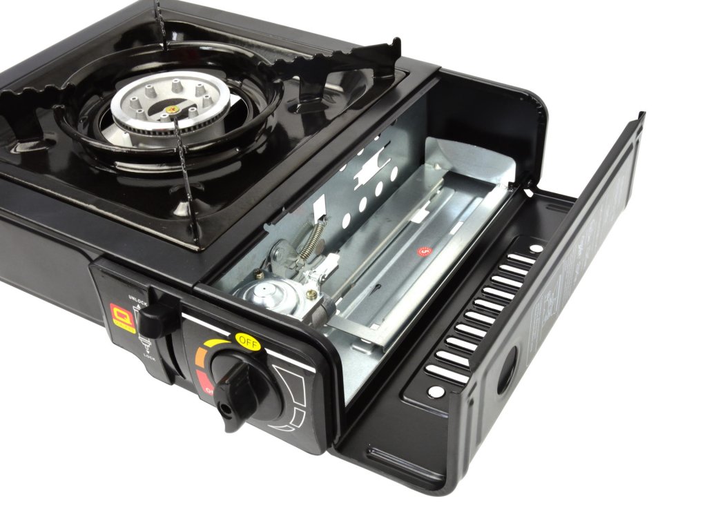Този туристически газов котлон работи с широко достъпни газови касети и е оборудван с пьезоелектрически запалвач. Благодарение на него не са нужни кибрит или запалка за запалване. Горелката разполага със специални вдлъбнатини, които осигуряват равномерно загряване на повърхността. Котлонът включва и приставка за грил, което го прави идеалното решение за екскурзии сред природата, къмпинг и други подобни дейности.