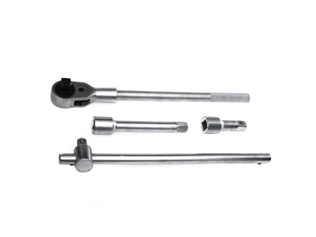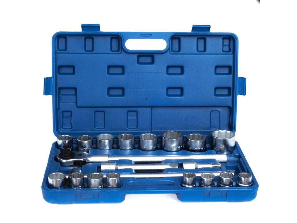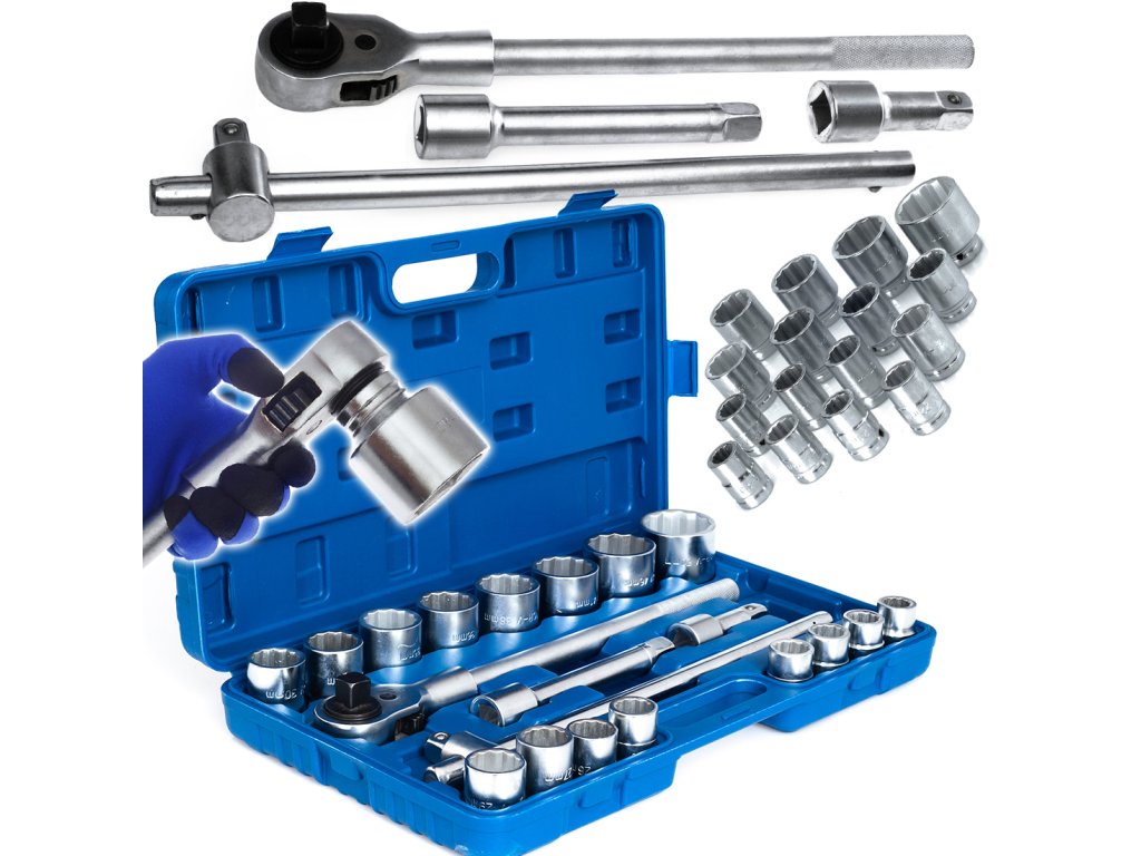 Предлаганият комплект се доставя в практичен пластмасов куфар за лесно транспортиране и съдържа вложки, висококачествена тресчотка и удължителни пръти с диаметър 3/4".