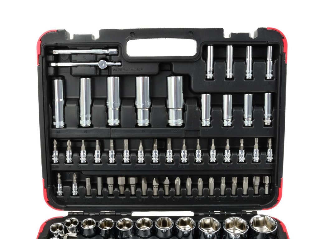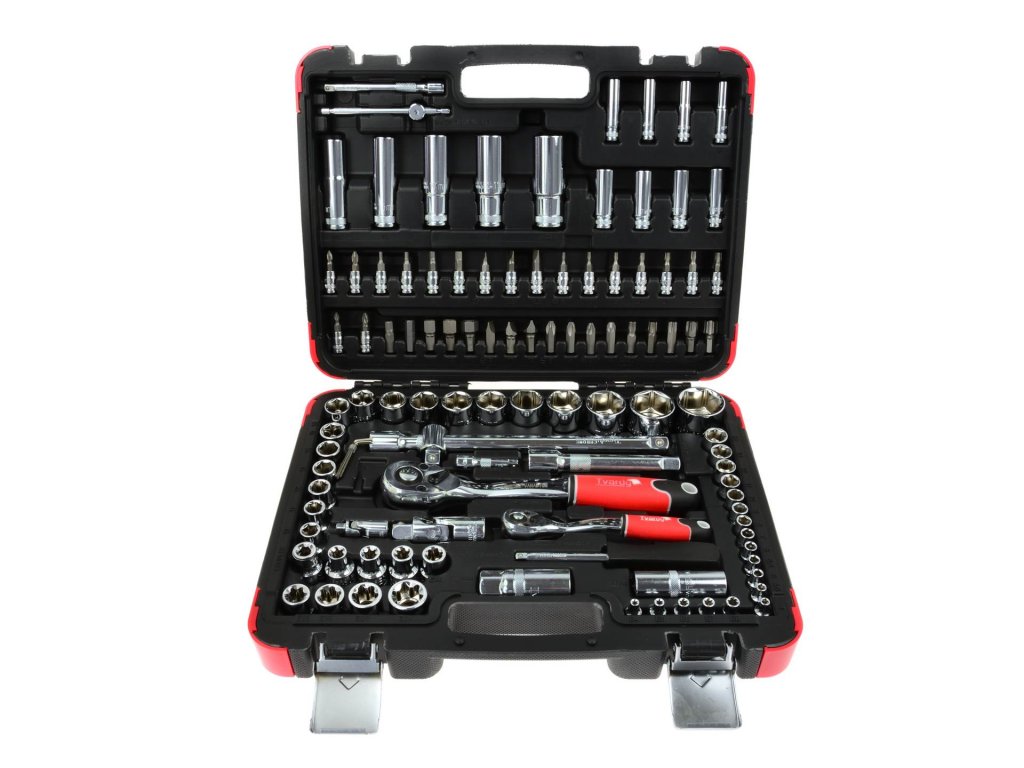 Комплектът включва два въртящи се тресчотни ключа с размери 1/2" и 1/4" с изключително здрав механизъм на зъбно колело с 72 зъба. Оборудването е богато и подредено в здрав, практичен пластмасов куфар. Освен това, за комплекта се дава 25-годишна гаранция.