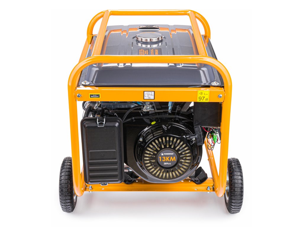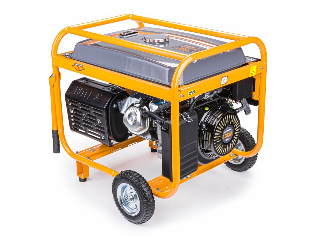 Генераторът произвежда ток с напрежение 230 V (с два контакта), което е идеално решение при липса на електрическо захранване на терен. Оборудван е с волтметър и предпазители. Датчикът за маслото автоматично изключва двигателя, ако нивото на маслото спадне под необходимото ниво. Стартирането се осъществява ръчно чрез лост, а електрическото стартиране става с ключ. Този генератор е отлично решение за използване в занаятчийството, строителството, градинарството и в паркови площи – както за захранване на електроинструменти, помпи, така и за осветление. Гумени амортисьори ефективно намаляват вибрациите, предавани от двигателя към корпуса на генератора. Генераторът е задвижван от едноцилиндров четиритактов OHV двигател с мощност 13 к.с., осигуряващ стабилни обороти дори при максимални натоварвания.
