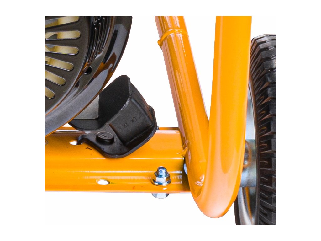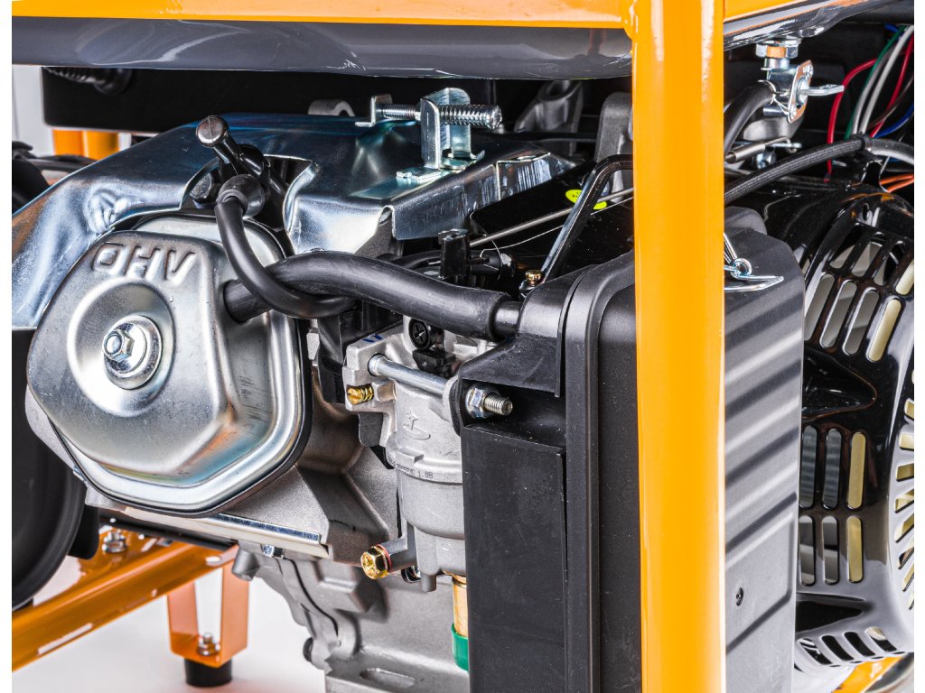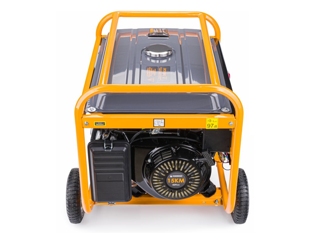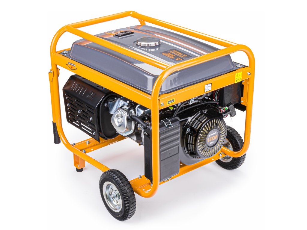 Генераторът произвежда електрически ток с напрежение 230V (1 контакт) и 400V (1 контакт), което е идеално решение при периодично прекъсване на електрозахранването на открито. Оборудван е с вграден волтметър и предпазители. Освен това разполага с датчик за нивото на маслото, който автоматично изключва двигателя при твърде ниско ниво. Стартирането е ръчно – с помощта на стартерно въже. Този генератор намира приложение в занаятчийството, строителството, градинарството и при работа с електроинструменти, помпи и осветление на открити площи. Гумените амортисьори ефективно намаляват преноса на вибрации от двигателя към шасито на генератора. Генераторът се задвижва от едноцилиндров четиритактов OHV двигател с мощност 15 к.с. Благодарение на високата си производителност, поддържа стабилни обороти дори при максимално натоварване.