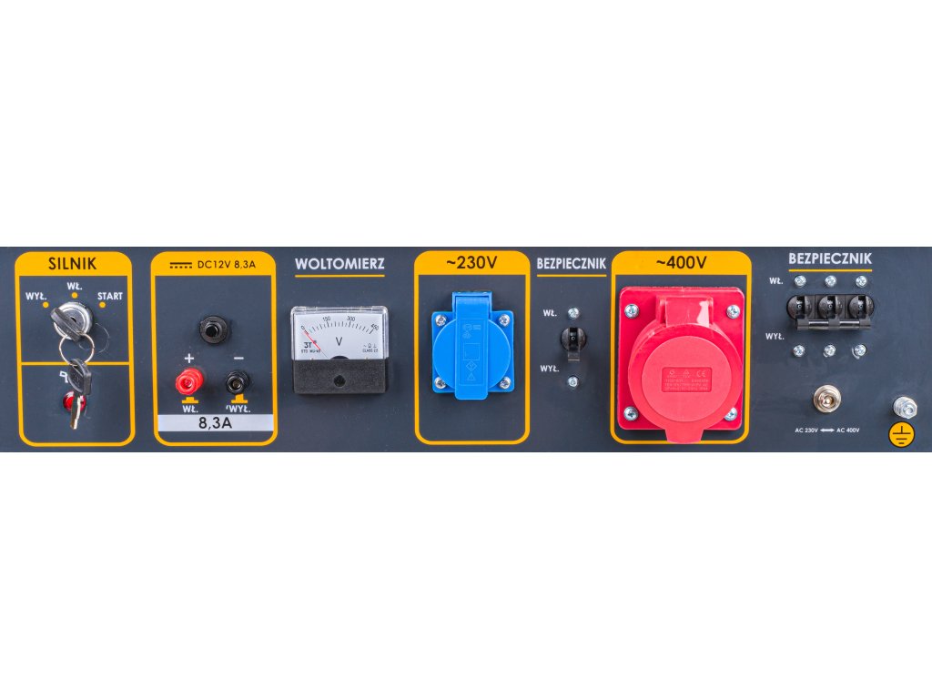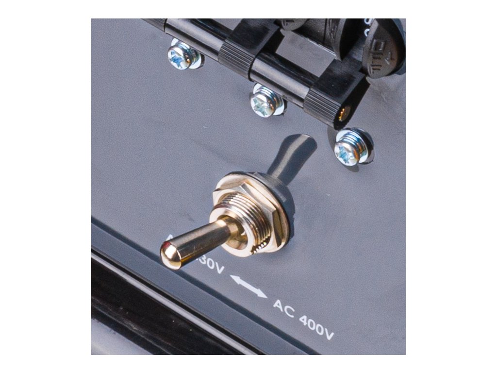 Генераторът е оборудван с превключвател от 400V на 230V, който благодарение на най-модерната технология позволява постигане на по-висока мощност на еднофазен контакт в сравнение с обикновените генератори.