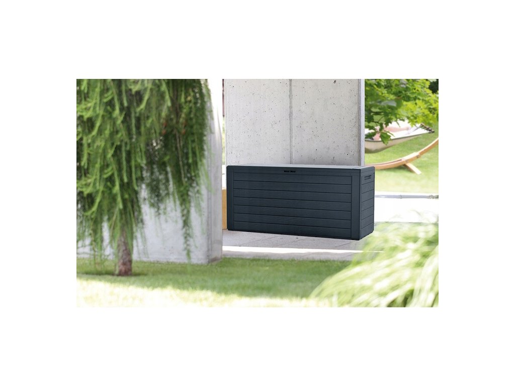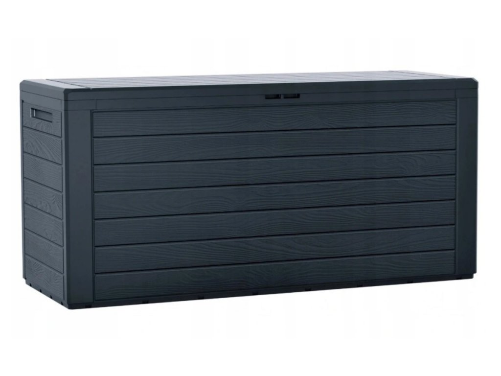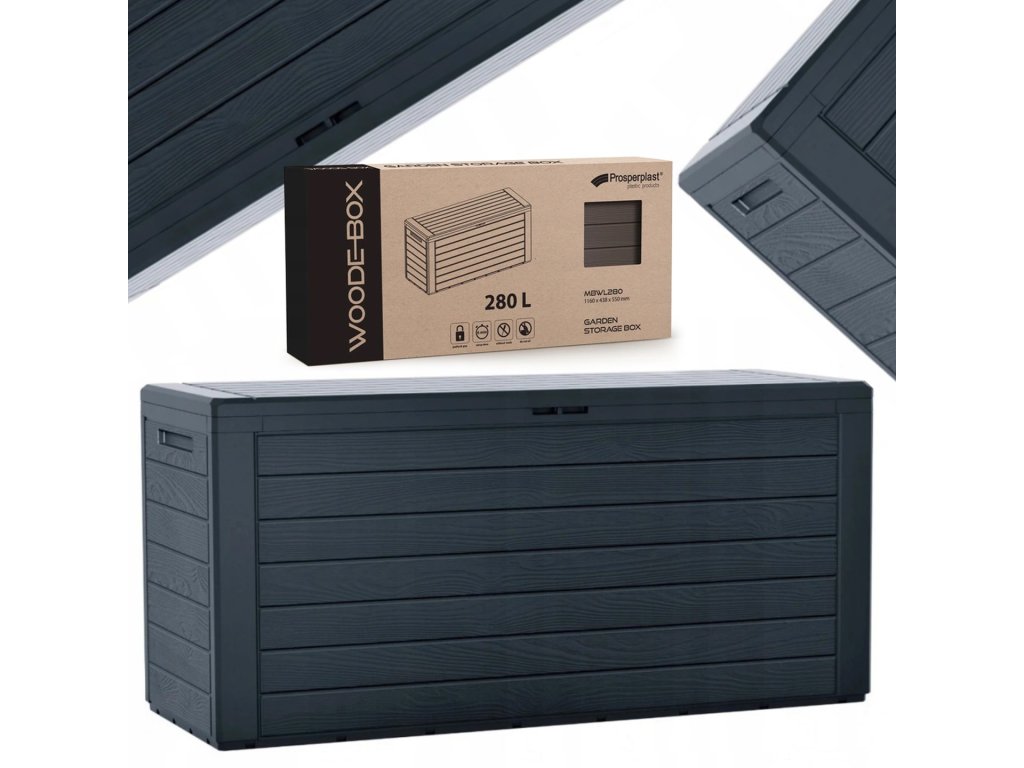 Градинска кутия за съхранение с голям обем от 280 литра е идеална за съхранение на градински инструменти, възглавници, градински маркучи и играчки. Кутията е изработена от здрав пластмасов материал с дизайн на дървени дъски и е подходяща за използване на балкони, тераси, градини или в гаражи. Защитава съхраняваните вещи от прах и дъжд и е лесна за почистване.