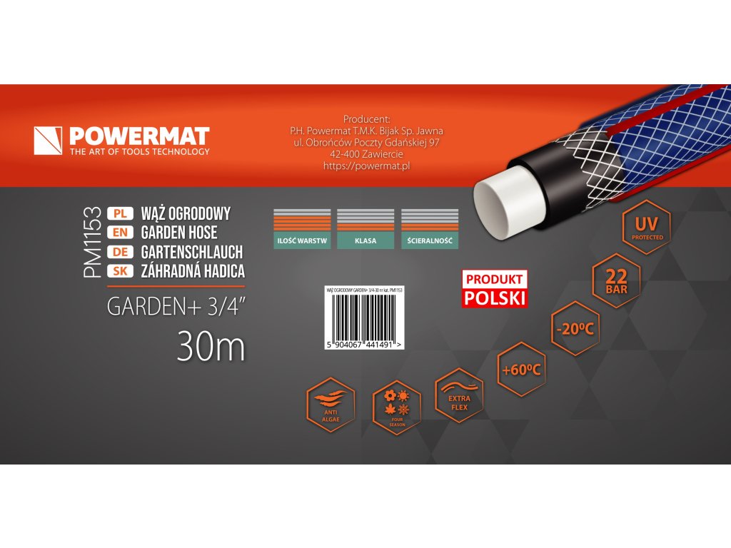 Висококачествен градински маркуч, произведен в Полша, отличаващ се с издръжлив материал, защитен от слънчеви лъчи и екстремни температури.