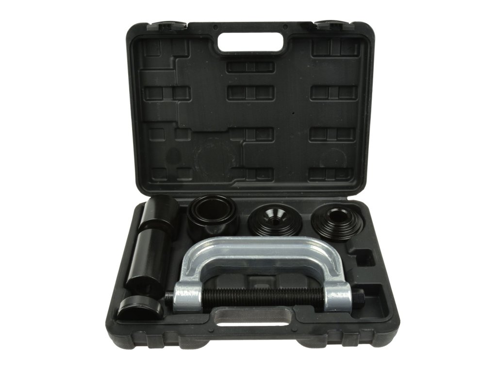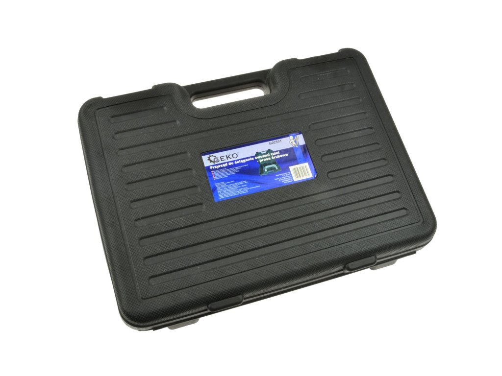 Инструмент за демонтаж на втулки - винтов преса G02591 е предназначен за лесен монтаж и демонтаж на плъзгащи се елементи, като сферични болтове и спирачни щифтове. Инструментите в този комплект са изработени от висококачествен чугун и закалена въглеродна стомана, което гарантира висока издръжливост и дълъг експлоатационен живот. Целият комплект е опакован в здрав пластмасов куфар за удобно пренасяне и съхранение.