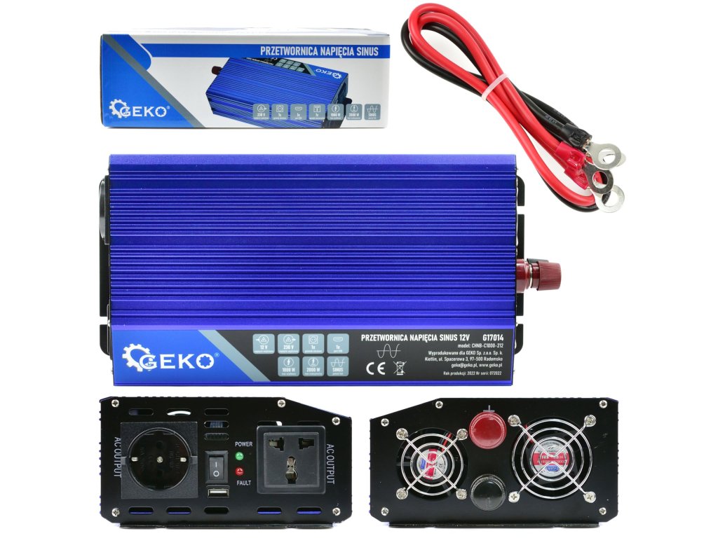 Инвертор 12V/230V 1000/2000W G17014 – чиста синусоида е идеалното устройство за преобразуване на прав ток от батерии с напрежение 12V в променлив ток с напрежение 230V. Оборудван е с USB порт за захранване и зареждане на мобилни устройства. За разлика от класическите AC/DC инвертори, синусовите инвертори генерират изходно напрежение с чист синусов вълнов профил, подобен на този в електрическата мрежа. Този тип инвертори е отличен за захранване на широк спектър от уреди като електроинструменти, помпи, радио и телевизионна техника, както и домакински уреди.