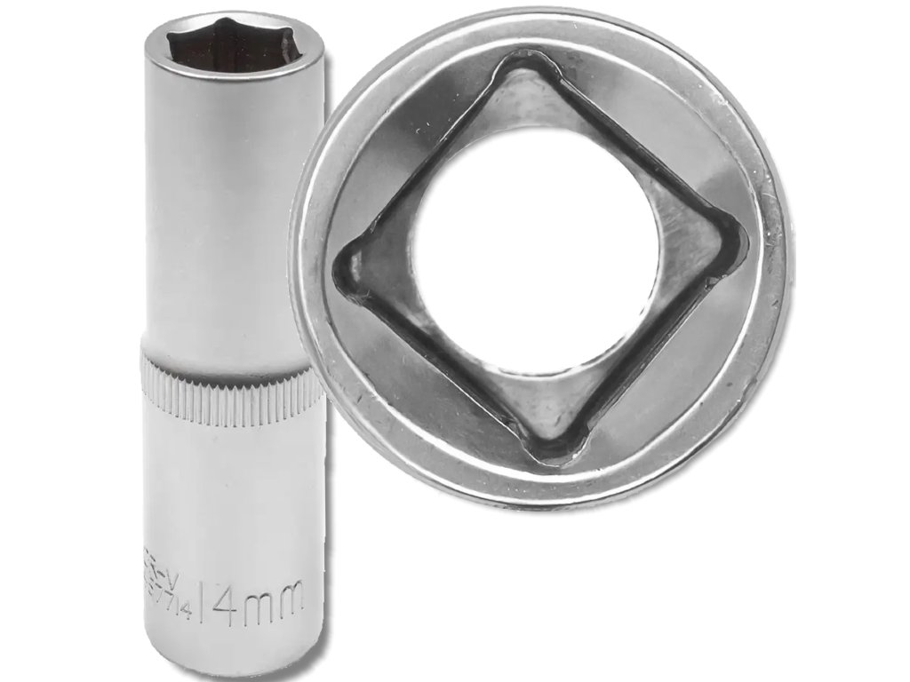 Дълбока ударна камбана 1/2" 14 мм (6-стенна) е незаменим инструмент, предназначен за работа с плътно закрепени гайки и болтове, особено ако крепежните елементи са разположени в дълбоки легла или на дълги щифтове. Благодарение на удължената конструкция и прецизния шестостенен профил, осигурява надеждно предаване на въртящия момент и минимизира риска от приплъзване и повреда на ръбовете на болтовете.