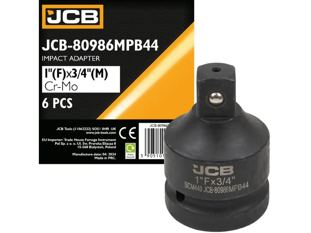 JCB Rázový adaptér, čtvercový 1" (vnitřní) x 3/4" (vnější), tvrzená ocel SCM440, Cr-Mo