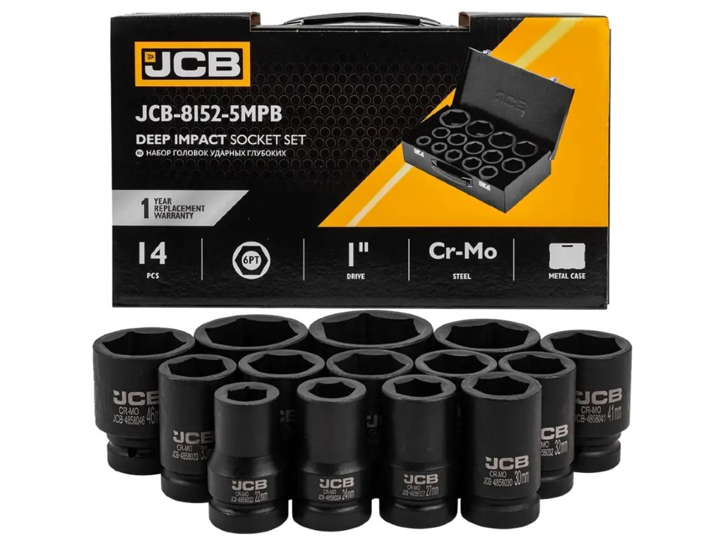 JCB Комплект от 14 бр. дълбоки ударни вложки 1", 6-стенни, Cr-Mo