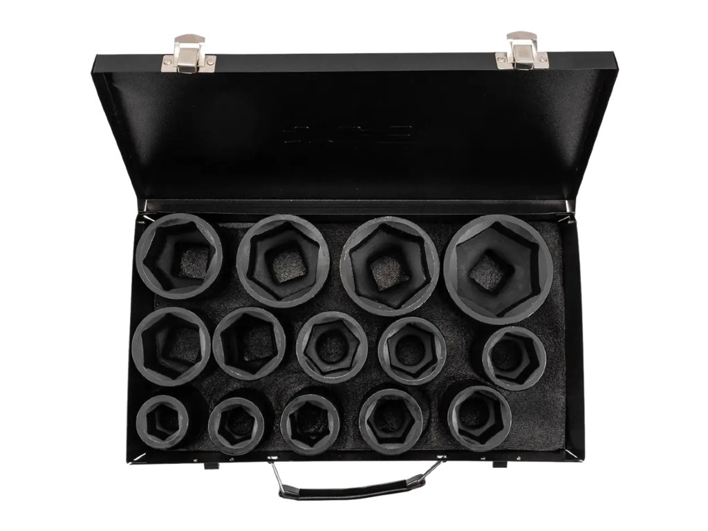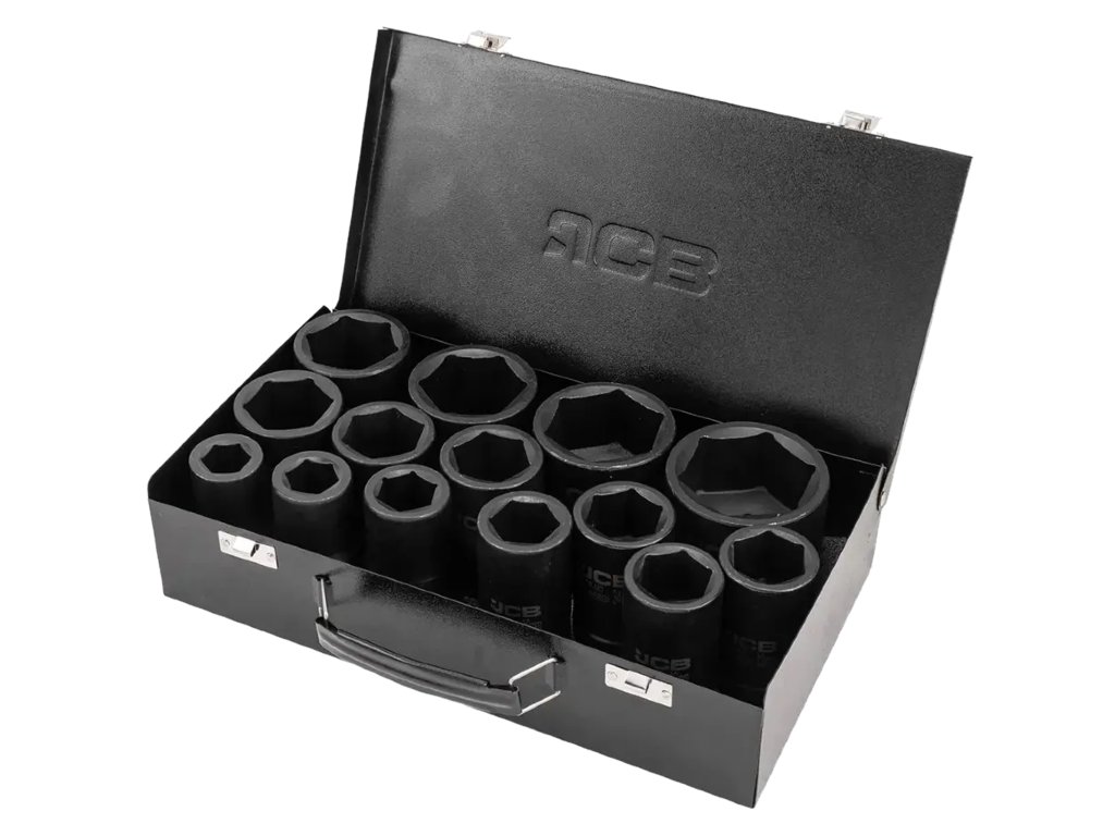 Комплектът от 14 дълбоки ударни вложки JCB Tools е професионален инструмент, предназначен за интензивна работа в работилница, включително монтаж и демонтаж на болтове и гайки с ударни гайковерти.