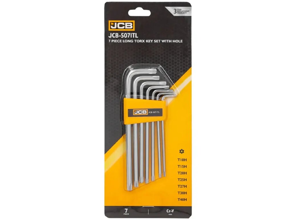 Комплект от 7 дълги TORX ключа с отвор (Security TORX, тип H/TN) марка JCB е незаменим инструмент за работа с компоненти, защитени със сигурностни винтове. Благодарение на отвора в опашката (в средата на върха), ключовете позволяват завинтване и развинтване на специални заключващи винтове, които се използват например в електрониката, алармени системи, индустриална автоматизация, сервиз на домакински уреди и превозни средства.