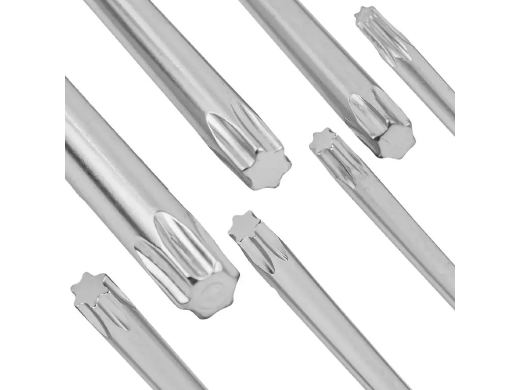Ключовете са изработени от здрава хром-ванадиева стомана (Cr-V), която гарантира висока устойчивост на износване, усукване и счупване дори при интензивна употреба в работилницата. Комплектът съдържа 9 от най-често срещаните размери TORX, необходими за повечето сервизни, електронни и механични работи.