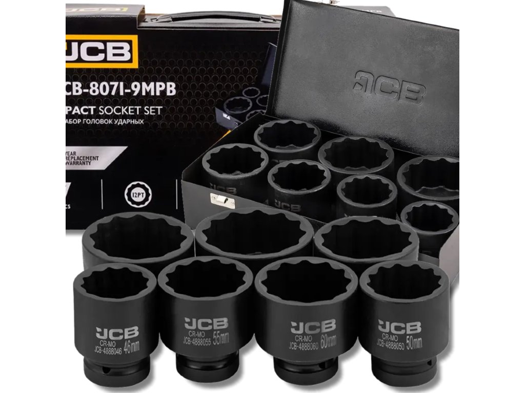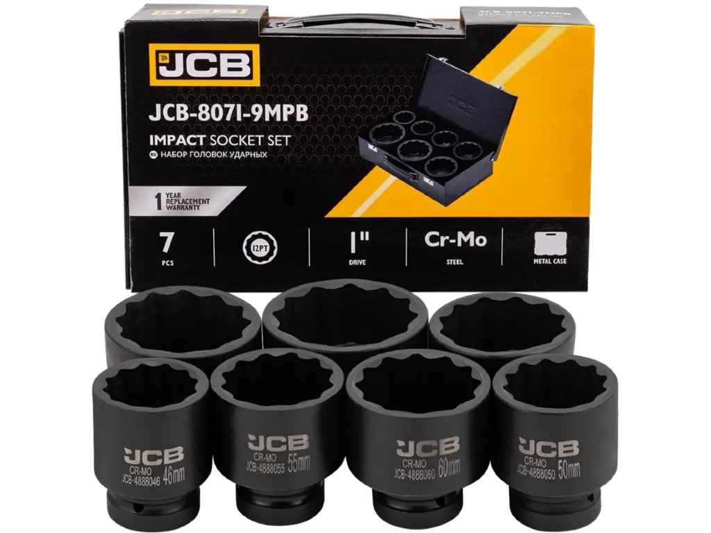 JCB-8071-9MPB е комплект от 7 ударни глави, предназначен за най-взискателните задачи в автосервизи, работилници и при монтажни дейности. Изработени от високоустойчива хром-молибденова стомана (Cr-Mo), главите предлагат изключителна устойчивост на напукване, удари и деформации дори при употреба с пневматични или електрически ударни инструменти.
