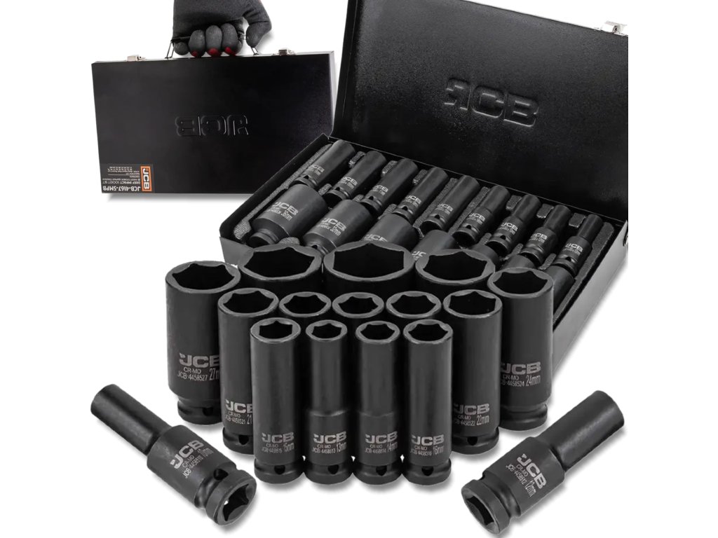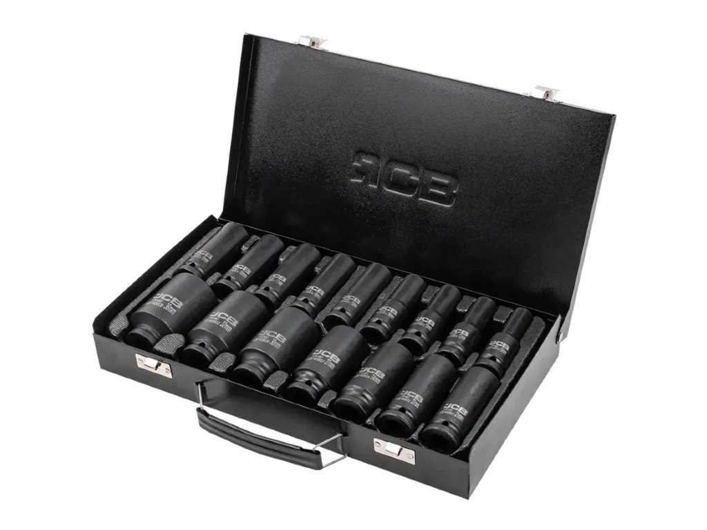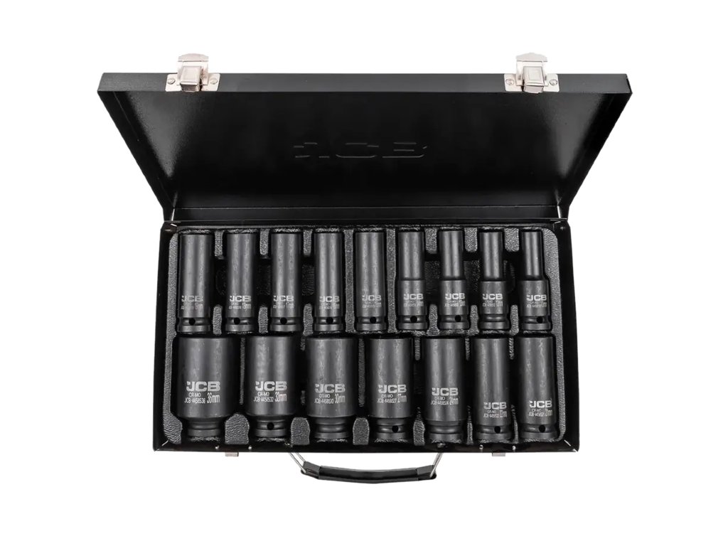 Комплект от 16 дълбоки ударни камъни JCB Tools JCB-4167-5MPB е професионален инструмент, предназначен за тежки работи в работилница, включително монтаж и демонтаж на болтове и гайки с ударни гайковерти.