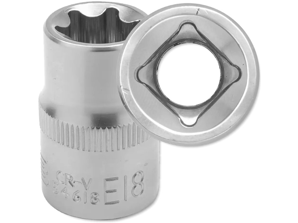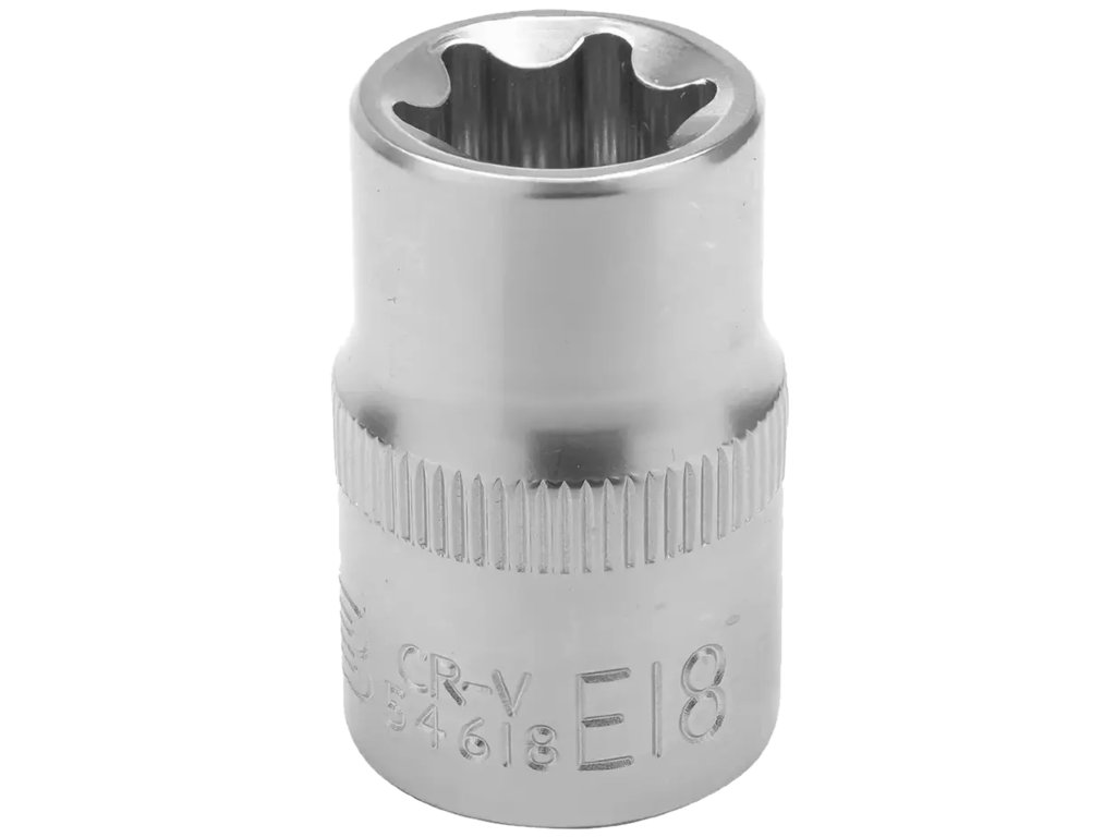 Накрайник с профил E18, 1/2” е надежден и издръжлив инструмент, предназначен за работа със съединители с външен профил Torx. Благодарение на прецизната изработка, той гарантира точно прилягане към винтове и гайки, като по този начин намалява риска от приплъзване и повреда на леглата.