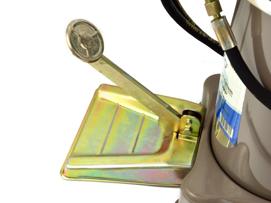 Маркучът на пресата е оборудван с въртяща се 360° пистолетна глава, съвместима с повечето стандартни накрайници за грес. Благодарение на педалното управление, смазката може да се нанася лесно и прецизно, което значително улеснява работата и повишава производителността.