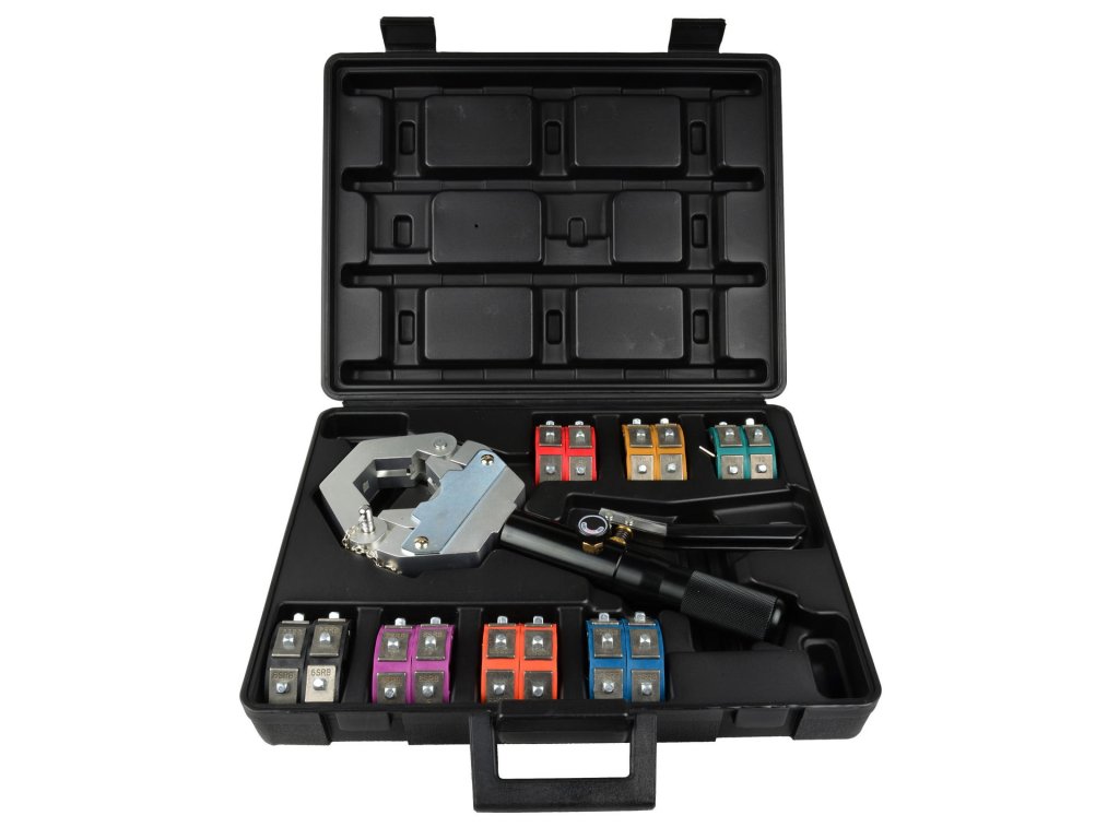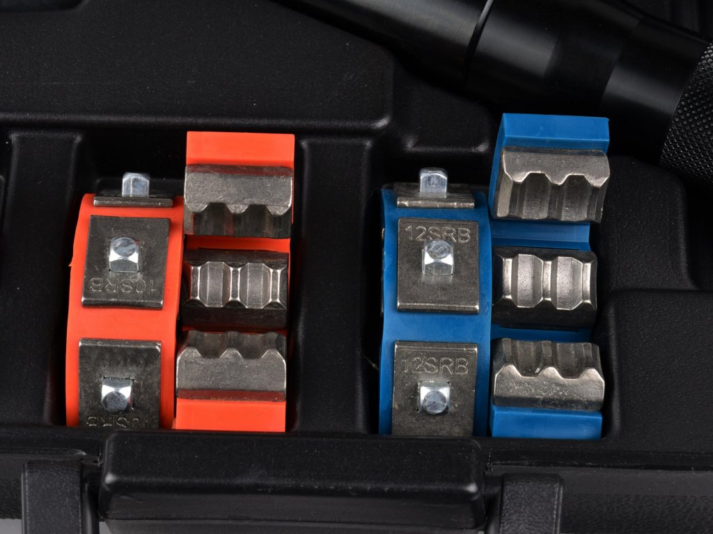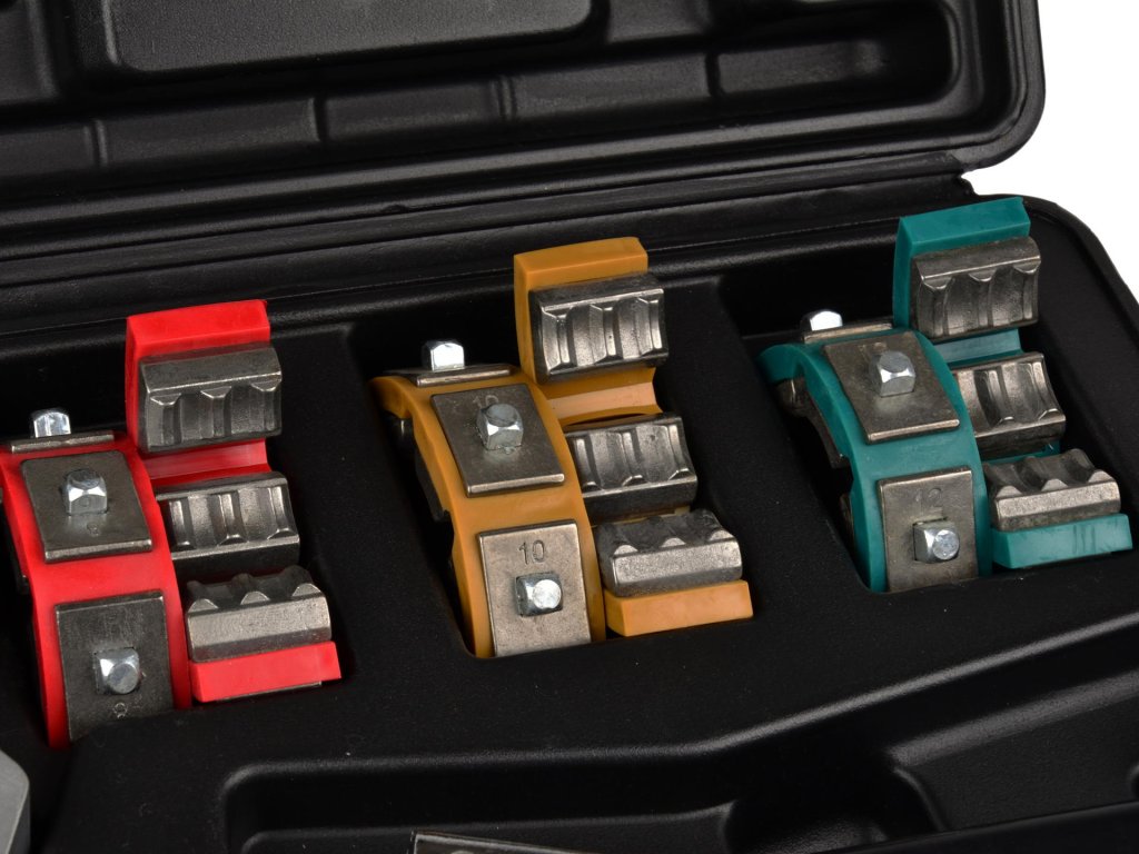 В комплекта на хидравличната преса за клещи са включени гайки за маркучи с различни диаметри. Целият комплект се доставя в здрав и естетичен куфар, което го прави подходящ както за работилницата, така и за работа на терен.